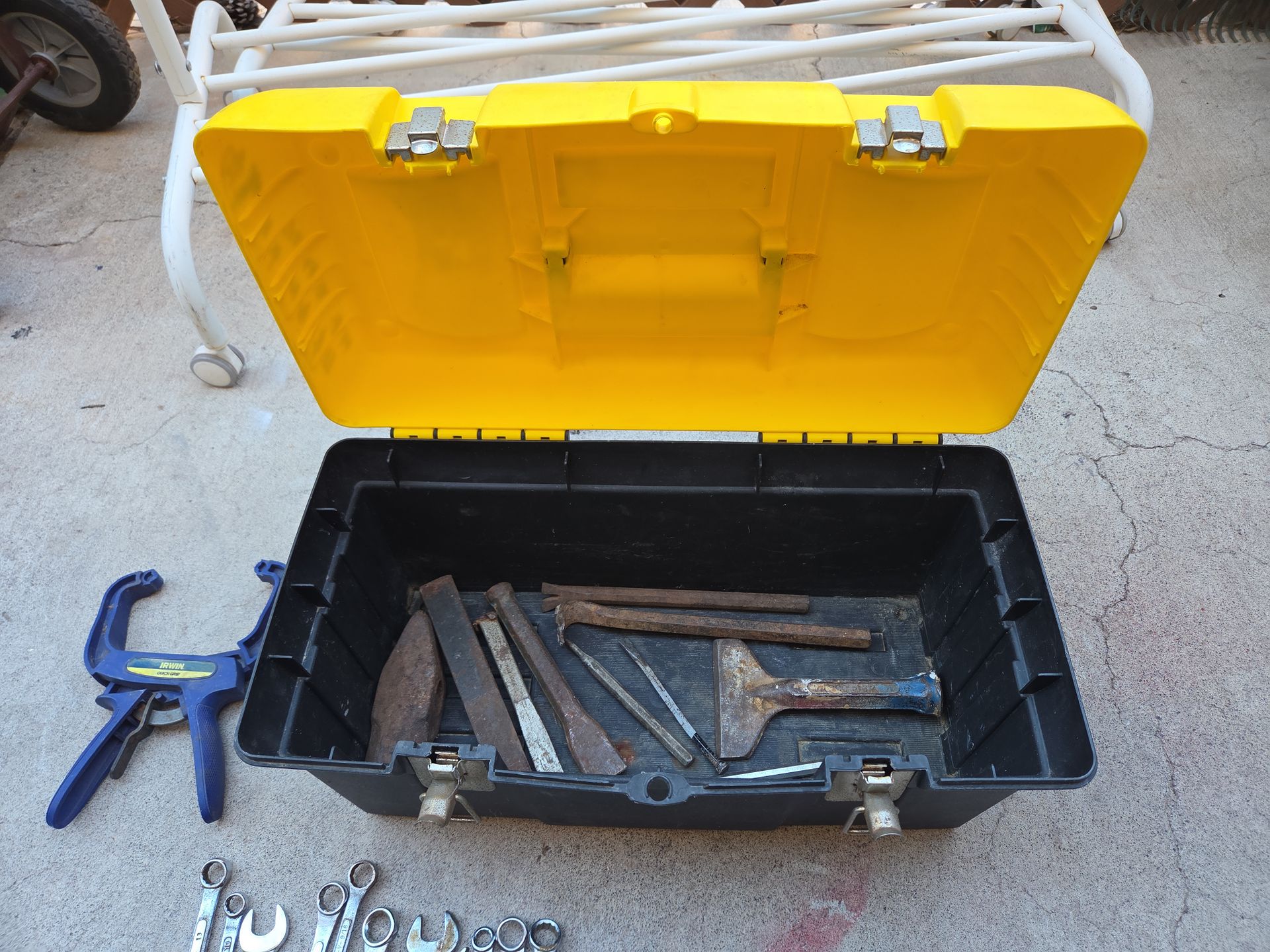 Tool box..misc tools..chisel, open end wrenches. Irwin clamp