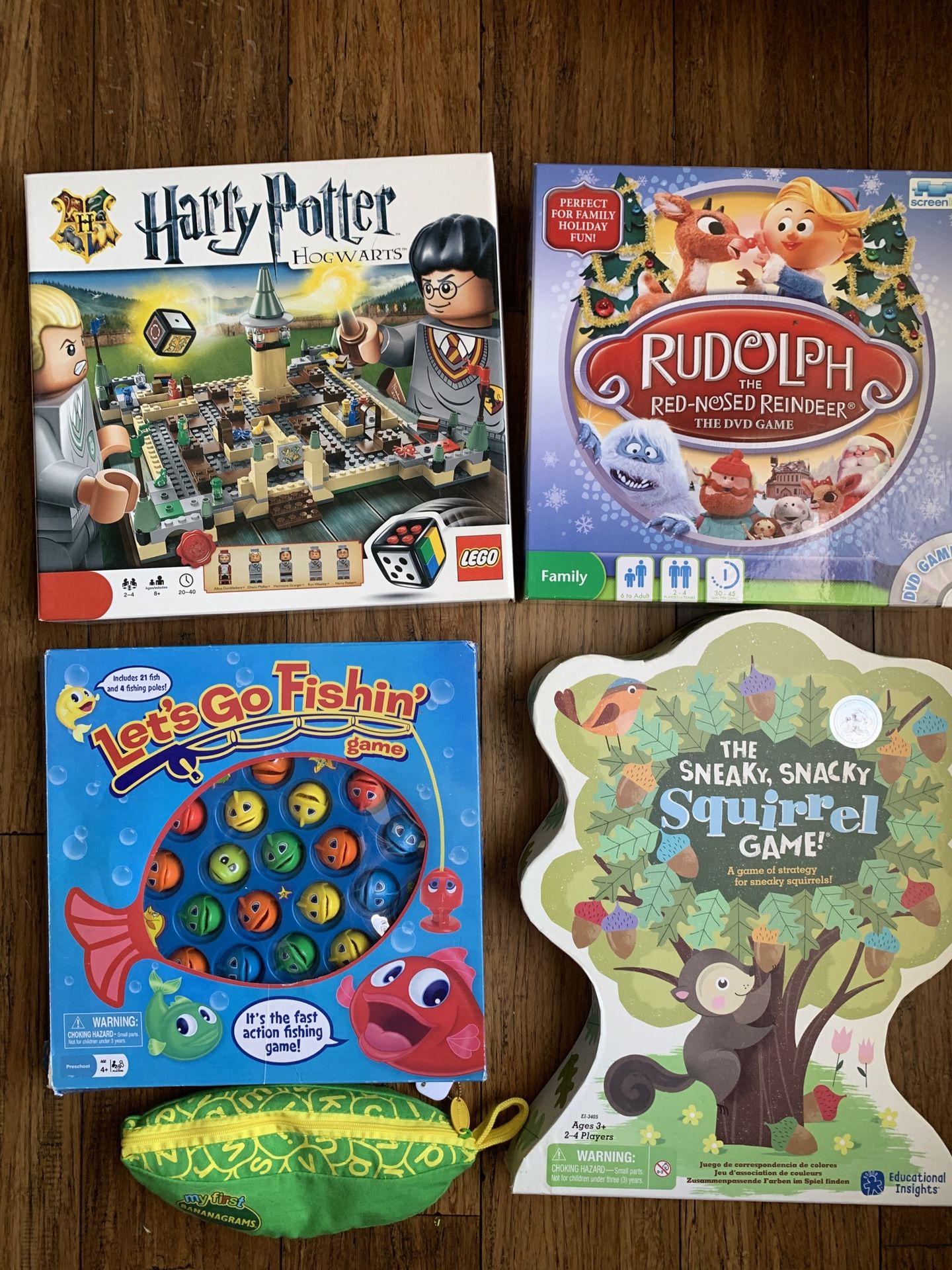 Banana grams, sneaky snacky squirrel, let’s go fishing, Rudolph, rednosed, reindeer, Harry Potter, Hogwarts Lego.