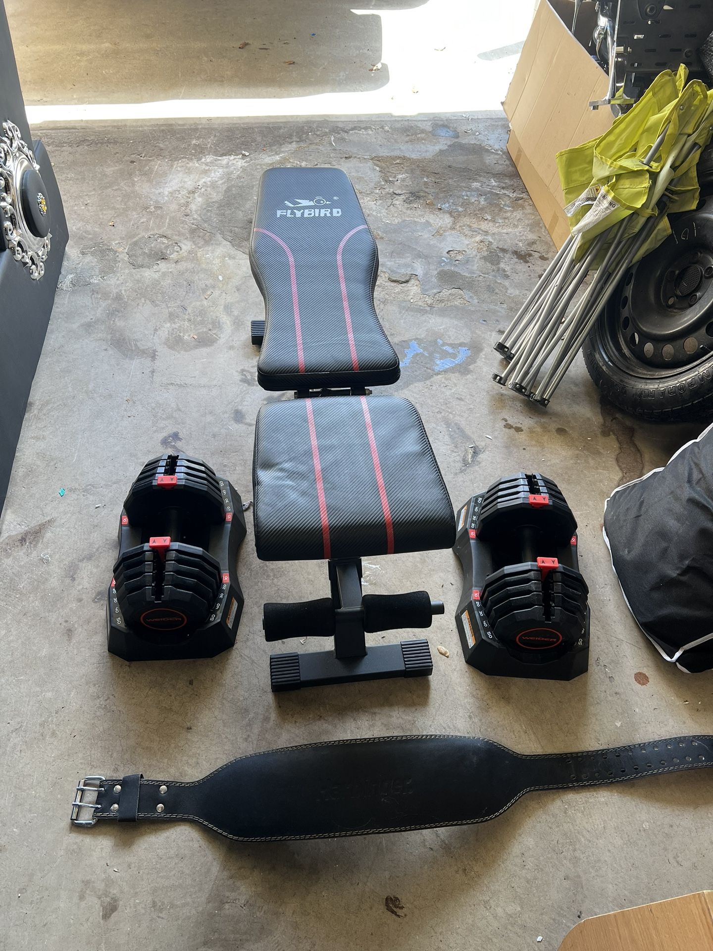Hello, I’m selling my dumbbells and the bench reclines it’s adjustable, The dumbbell is adjustable up to 50 pounds and you will also the weight belt. The bench and the weights are almost brand new. I barely use them. I have a truck if you need me to deliver for additional $50.
