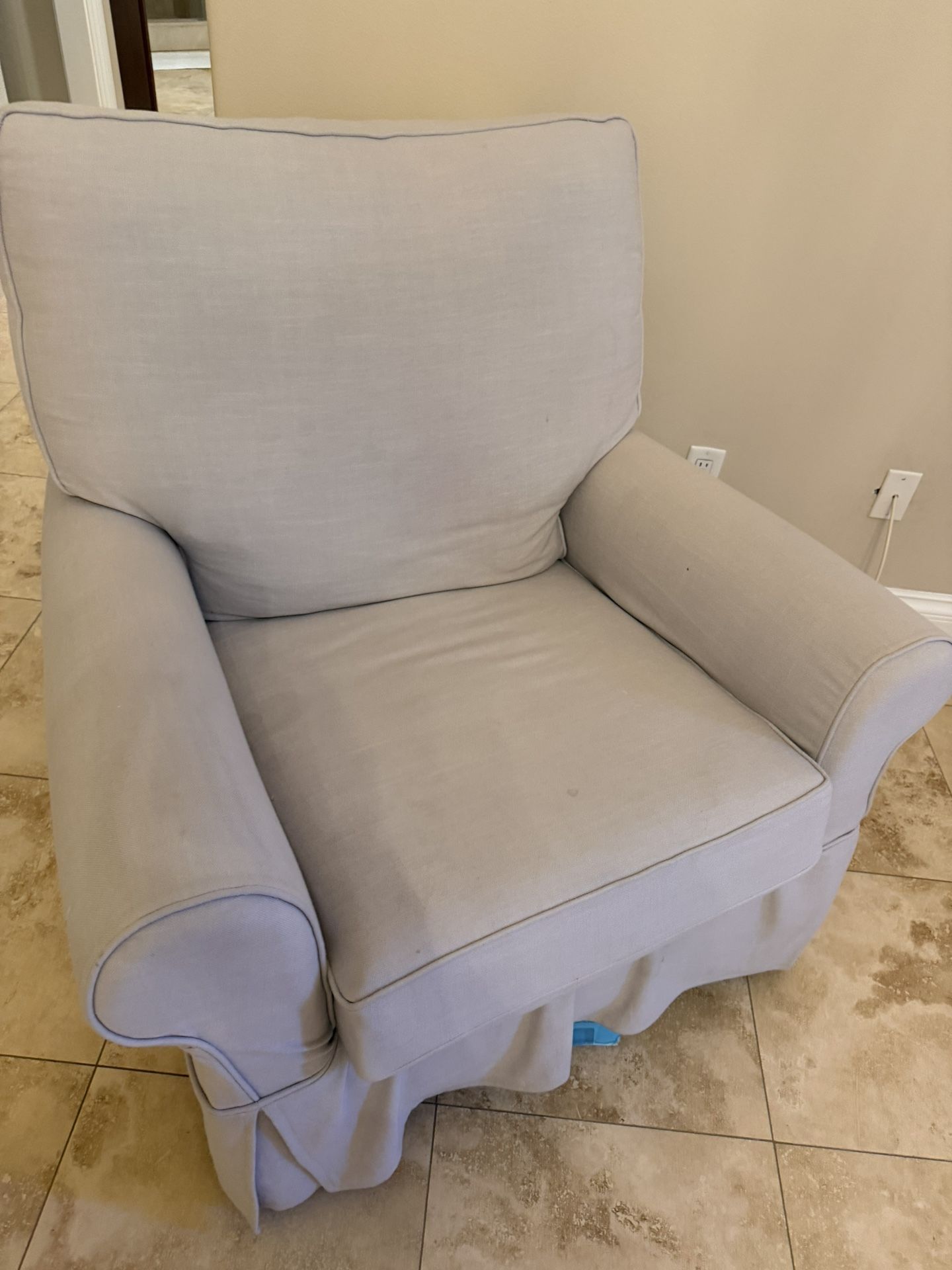 Light gray extra large nursery rocker and ottoman. No recline but very comfortable. Good to great condition. One small rip back corner. Covers washable. Non smoking. Dog friendly home. Near summerlin library.