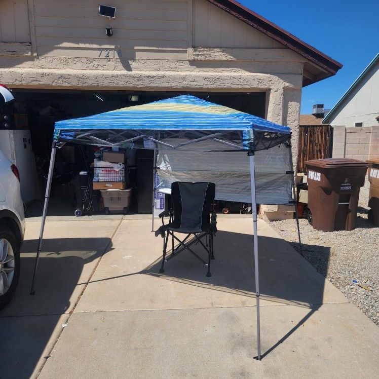 Yoli LiteTrek 36 7' x 7' Slant Leg Instant Canopy with Backpack 1-piece steel frame Rain resistant 190T polyester top Aluminum backing provides 99% UV protection Back wall for shade No assembly required Fits in provided 600D backpack Fold to be less than 28" and weighs under 18 lbs. 7' x 7' instant canopy (Canopy Measured at Footprint) Includes canopy, integrated wall, 600D backpack and 4 stakes 36 square feet of shade