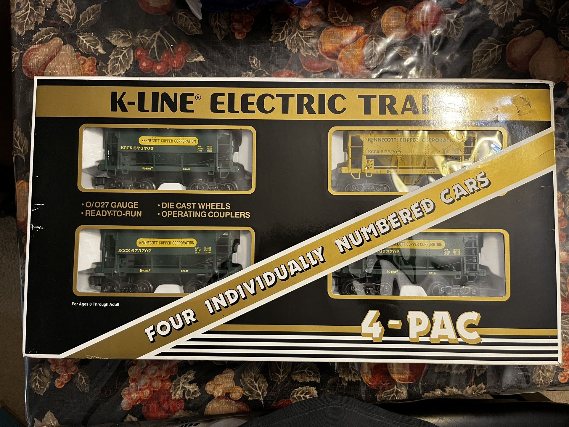 K-line Electric Trains KCC Classic Ore Car 4-pac - 4 Cars labeled Kennecott Copper Corporation - 3 Green cars with copper loads - 1 Car with a silver load