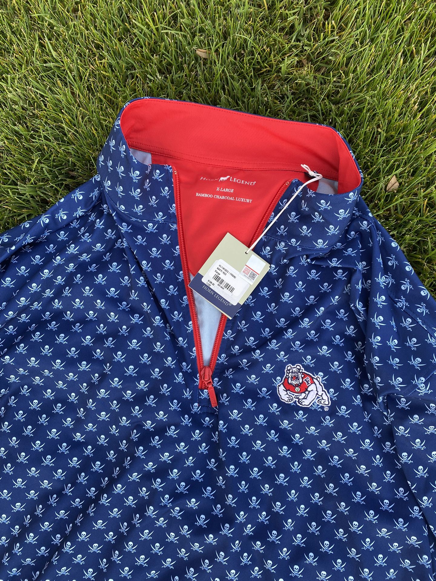 New Fresno State Horn Legend Quarterzip Pullover Skull Pattern Charcoal infused fabric Very comfortable and cool fabric Perfect for summer I already have one that I wear so selling the other one that hasn’t been used yet. Perfect for golfing in. Size XL Brand New with tag Selling for $75 Cost me $138.00 Fresno state football gear Fresno State Bulldogs 559 quarterzip skull pattern Horn Legend Golf apparel golf clothes fresno state go dogs sports wear