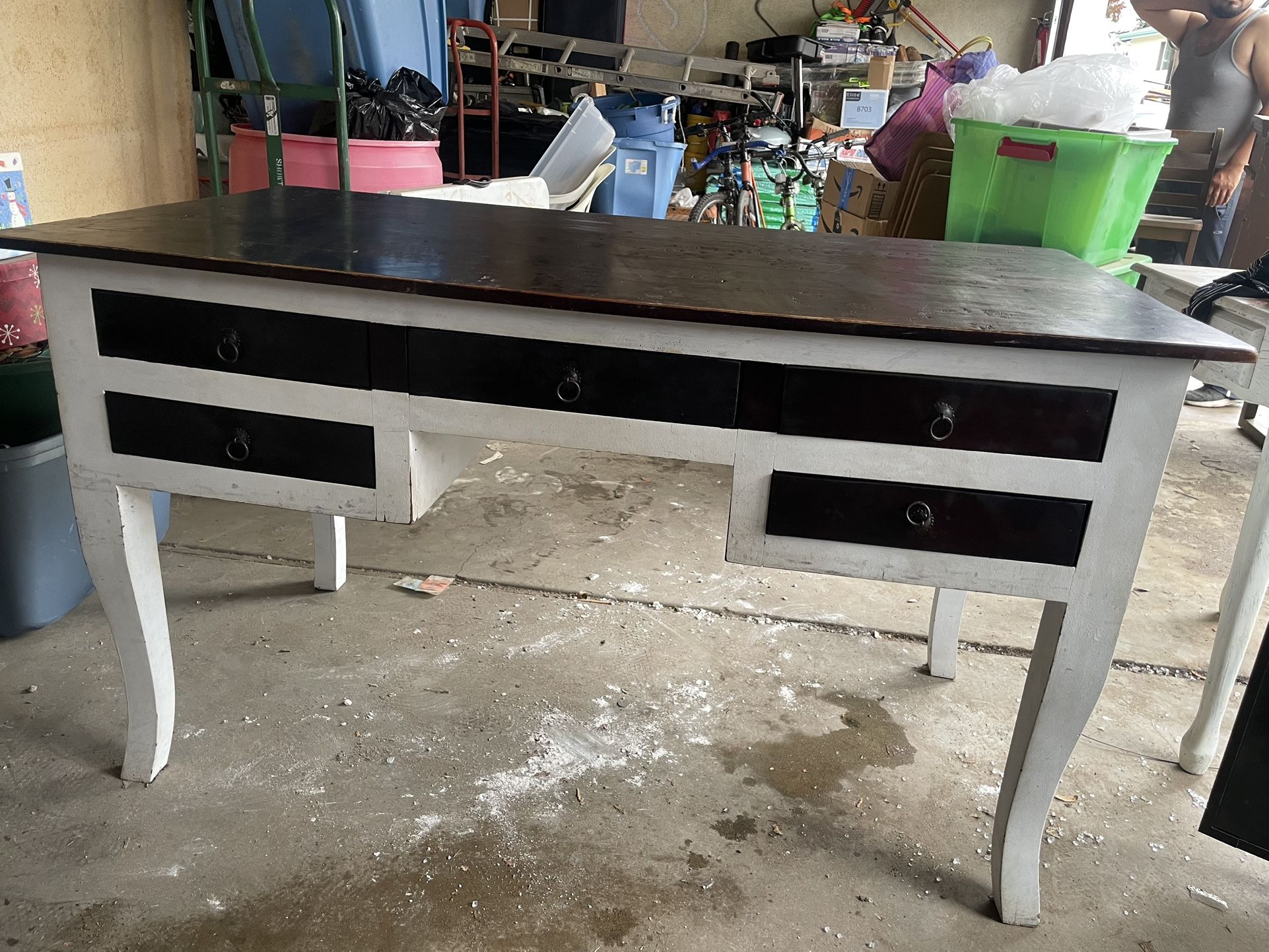 Heavy wooden desk , does show wear . Great to refurbish . cleaned it as much as I can . 55”W x 29” L x 31” H . Person I bought this from years ago said it was pottery barn but I’m not 100% sure NEED THIS GONE