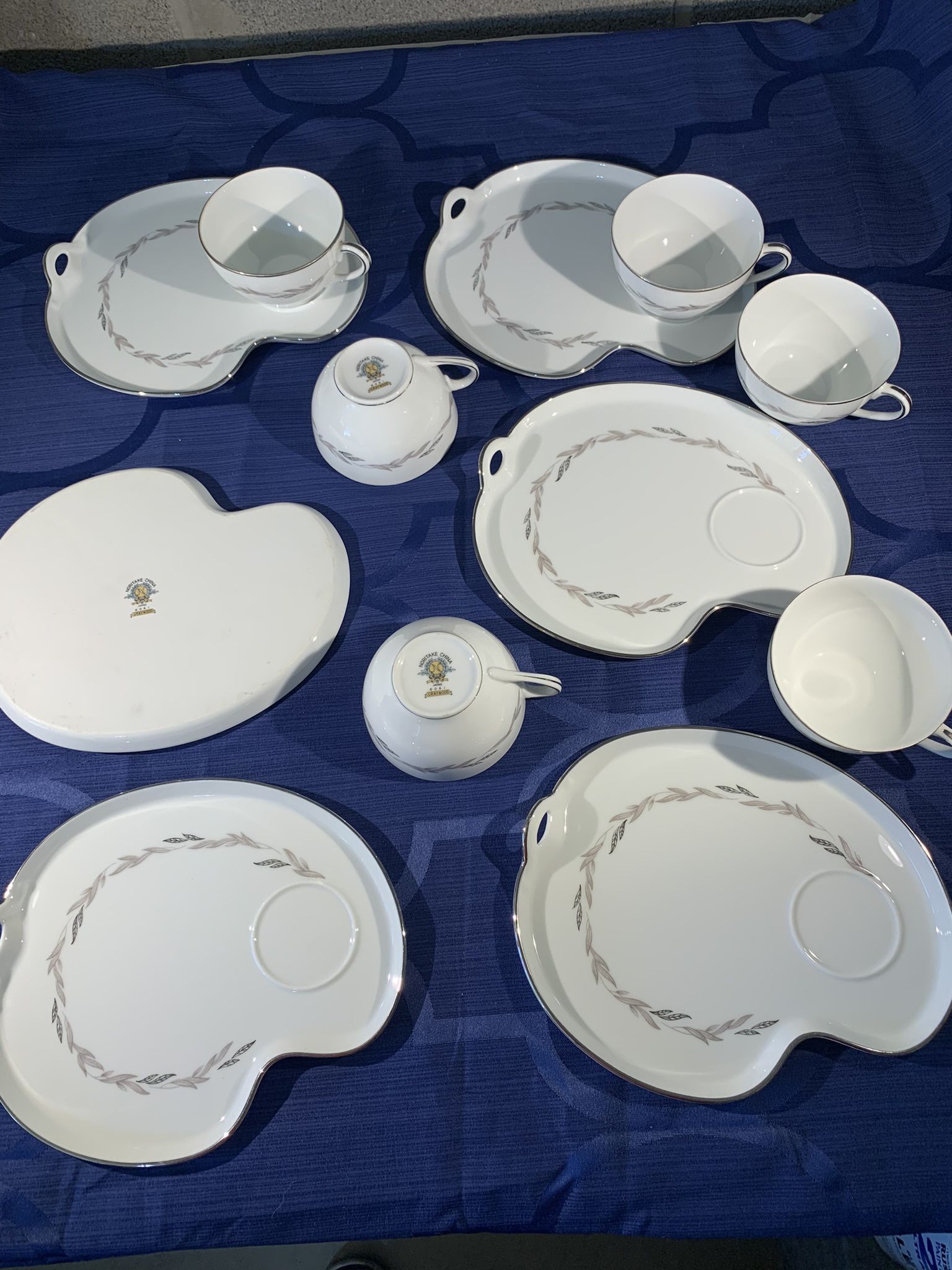 The gorgeous set of fine China white with silver leaf trim is in excellent condition and never used. No chips, cracks, or scratches. 12 Total pieces. Six trays and 6 delicate tea cups.