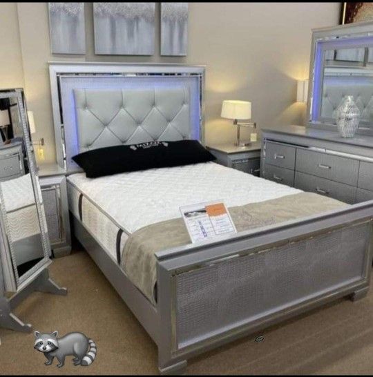 ALLURA SİLVER BEDROOM SET QUEEN OR KİNG BED DRESSER NIGHTSTAND AND MİRROR WİTH İNTEREST FREE PAYMENT OPTİONS