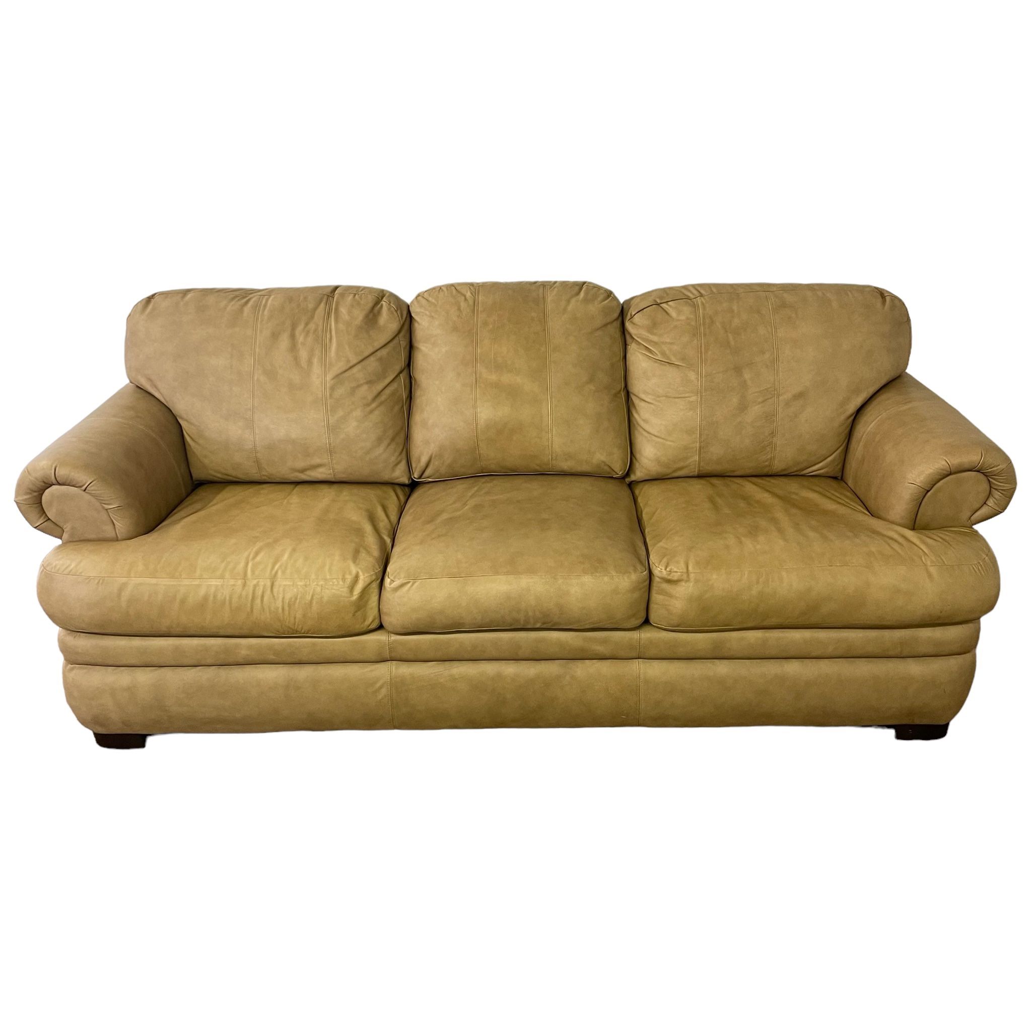 Order and schedule your delivery at OneUpFurniture(DOT)com Over 100 sets to choose from We are trusted and have 200+ reviews on Google. Item Notes: Great overall condition Brand is La-Z-Boy No rips tears or stains, one scratch on the back middle cushion pictured and in the video Real leather Seat cushions are removable and unzip, backs are attached Beige/Tan Very comfortable Measurements: 90” Height: 31” Depth: 37.5”