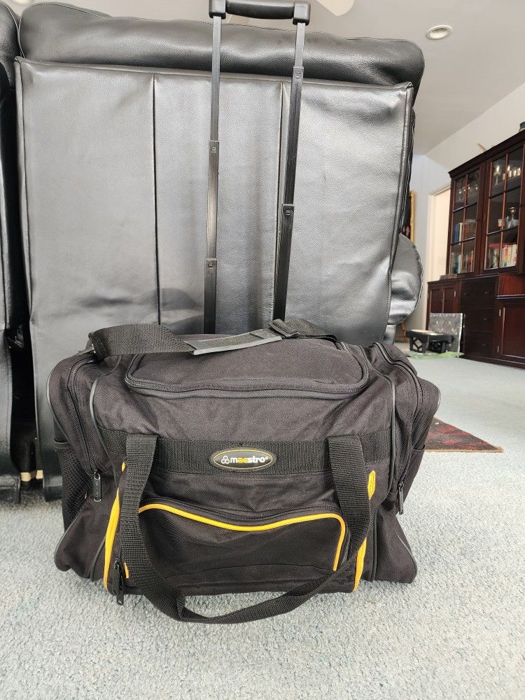 Black Maestro Travel Duffle with Retractable Luggage Handle and Wheels. In excellent condition. No signs of wear. Only selling because I upgraded to something else. Features one large compartment with zipper, a front zipper pocket, and 2 large side pockets with zippers. Also has optional shoulder strap which can be removed. Lots of storage, lightweight, and folds up small when not in use, making the perfect accessory for small spaces. Can be used as a duffle bag since it has velcro carrying handles. Colors: black and yellow. When full bag measures approximately: 21 in wide, 12 in tall, and 14 in deep.