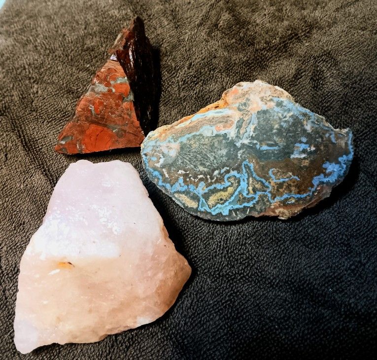 Top left - red Jasper two polished sides Top right - moss agate or maybe Turkish agate definitely some kind of agate, one polished side Bottom left- pink quartz They are all comparable in size, 5" max around the size of your typical salt/pepper classic Shaker bought ar grocery store. 15 each or all for 30