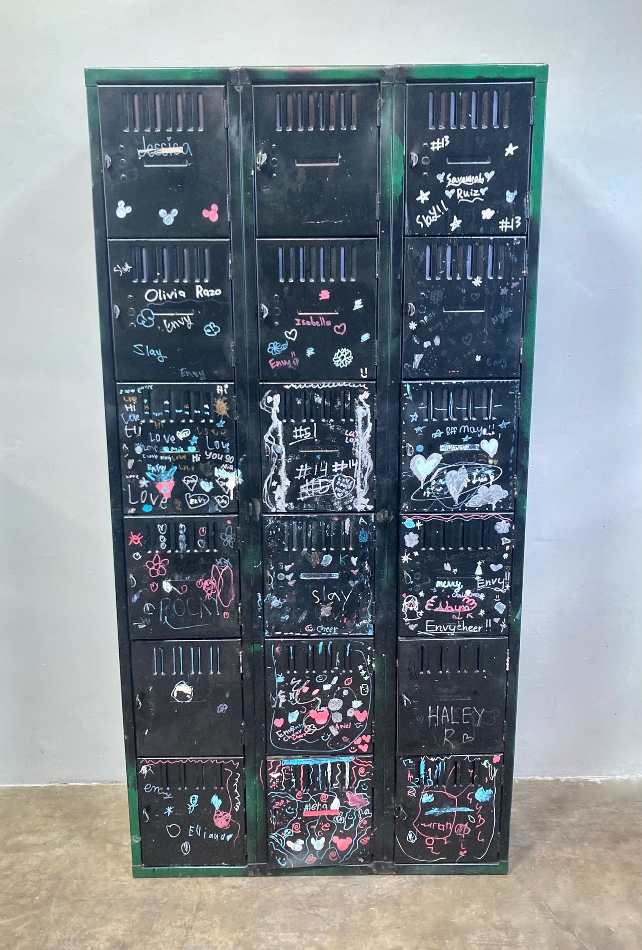 18 cubby locker, with doodles and notes decorating the front. We finished it with a laquer top-coat to preserve the drawings. Base painted in black and green. Ready to be used as home or workplace storage. 36"w x 12"d x 72"h —------------------ Rehab Vintage Interiors Come see us in person! 3086 W. Valley Blvd, Alhambra, CA 91803 Tues - Sunday 12pm to 5pm
