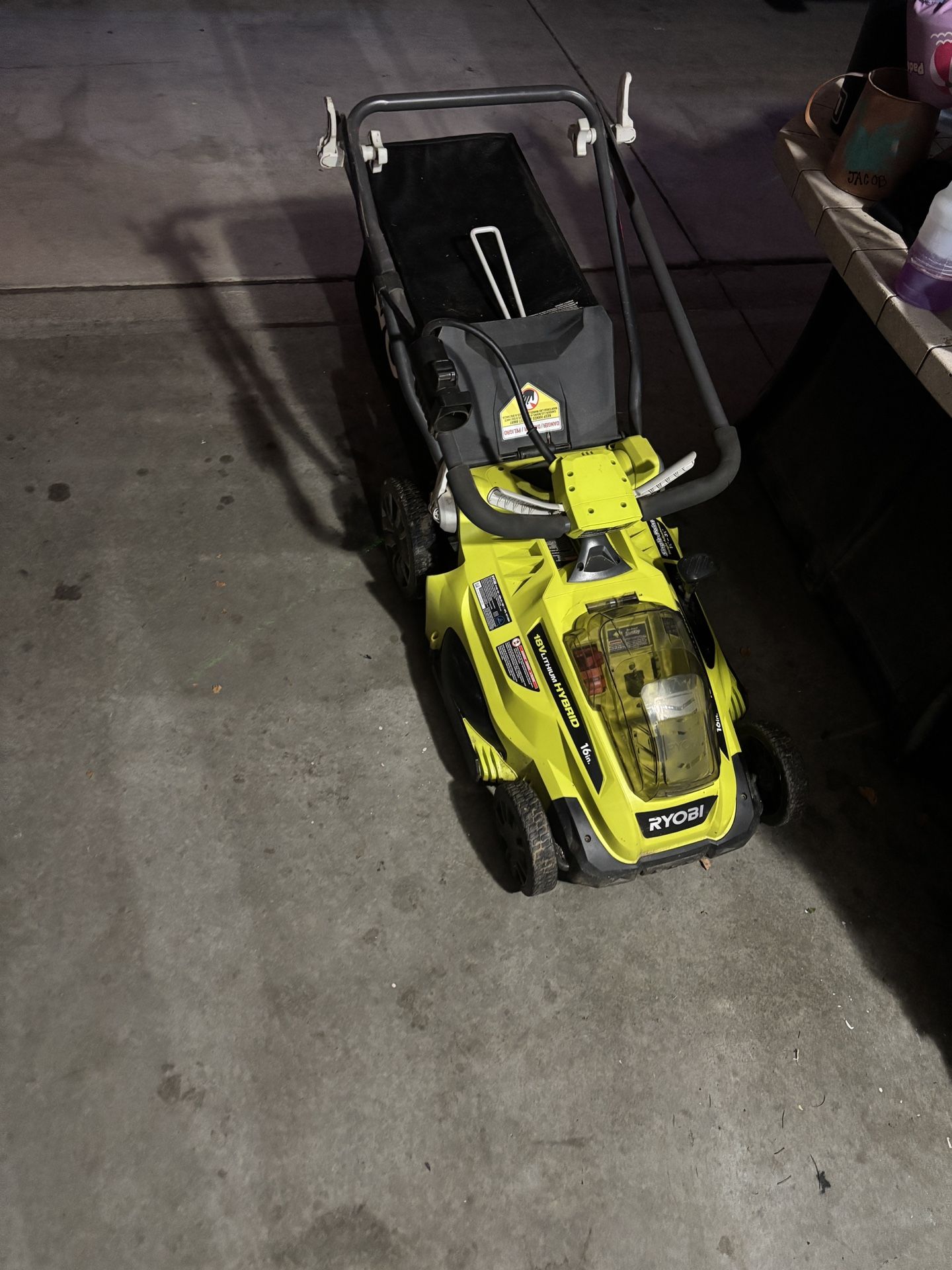 Ryobi brushless 18 volt lawn mower. Cordless or corded hybrid. Also can use with 1 or 2 batteries. Like new only used once to pick up some leaves on the lawn to test it out. Really nice lawnmower. Tool only.