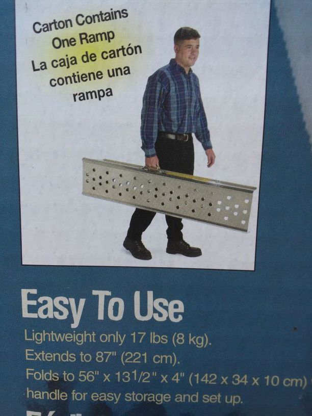 Folds to 54 inches and extends to 84 inches. Heavy duty aluminum motorcycle ramp shiny brand new in the box. 1000 pound distributed load capacity. Made in the USA. Cash and Carry only you pick up. If this listing is visible the product is still available. Please no stupid questions.
