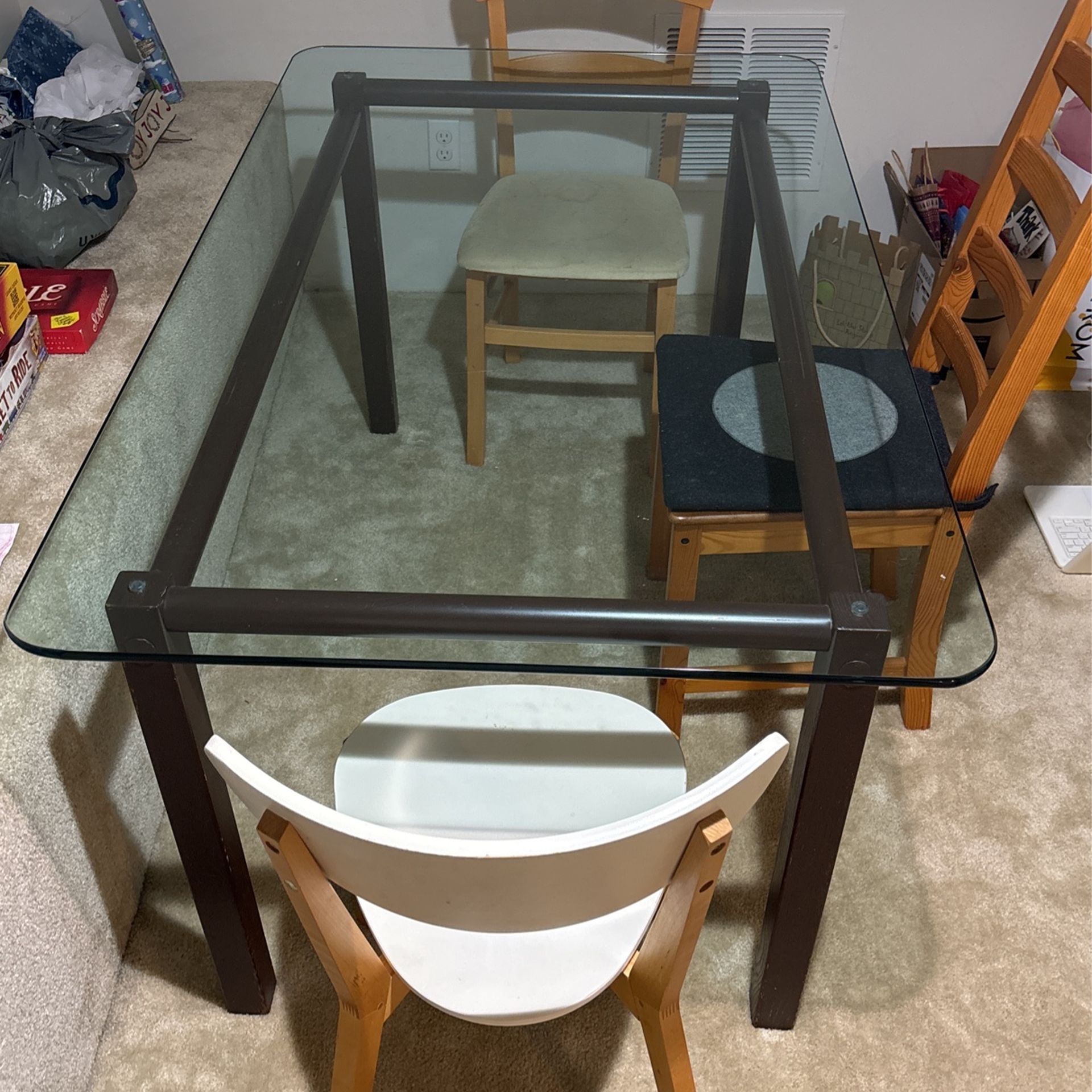 Good size for 4-6 people to eat at, we’ve squeezed in 8 for a dinner party. Was a good size for our townhouse but we haven’t used it since moving into a bigger house. Glass top is heavy enough that you probably want two people to carry it. I can help you carry it to your car. Top is 60”x36”; 29” tall solid/sturdy Three mismatched chairs, too!