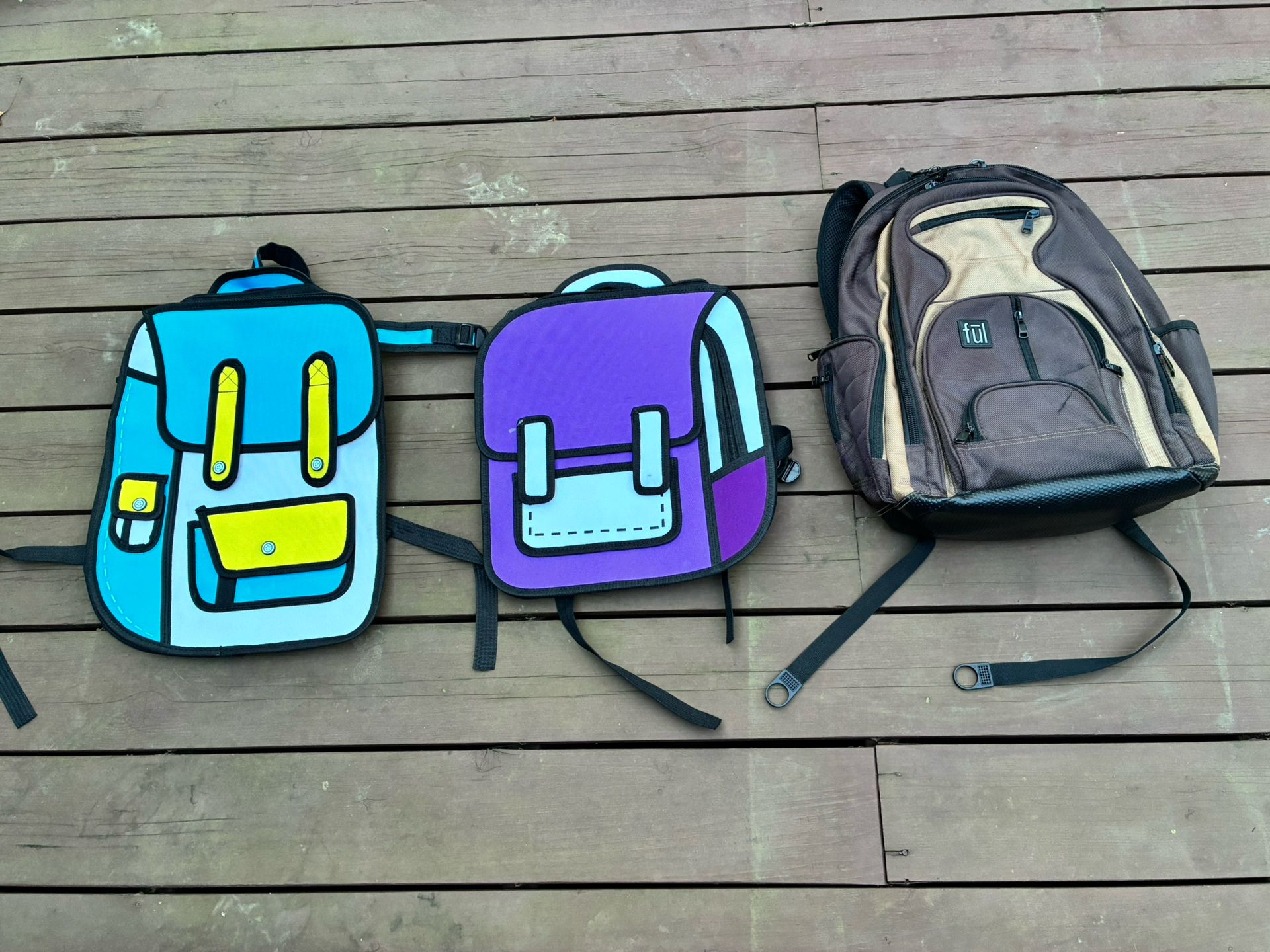 1) Ful laptop backpack (padded) with lots of pockets (heavy duty) Sells for around $50 on internet. 2) and 3) Spera Kawaii 2D style cartoon backpacks (Sell for around $15 each on internet)