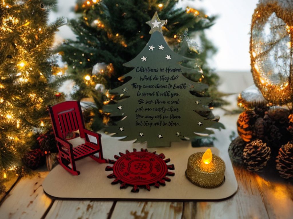 ✨ A Christmas Seat for the Ones We Miss ✨ Bring a little piece of Heaven into your holiday home with this beautifully crafted memorial Christmas display. This heartfelt set includes a delicate Christmas tree engraved with the beloved poem “Christmas in Heaven,” a tiny red rocking chair, a patterned rug, and a shimmering LED candle—creating a peaceful place to honor those who can’t be here but are always in your heart. Set it on your mantel, dining table, or next to your Christmas tree as a gentle reminder that love never leaves… it just finds a new way to sit beside us. Add an additional chair for $3 (tree is centered for 2 chairs) 🎄 Perfect for: • Memorial displays • Christmas décor with meaning • Thoughtful gifts for someone grieving • Holiday remembrance tables Handmade. Meaningful. A truly comforting way to feel close to the people you miss most this Christmas.