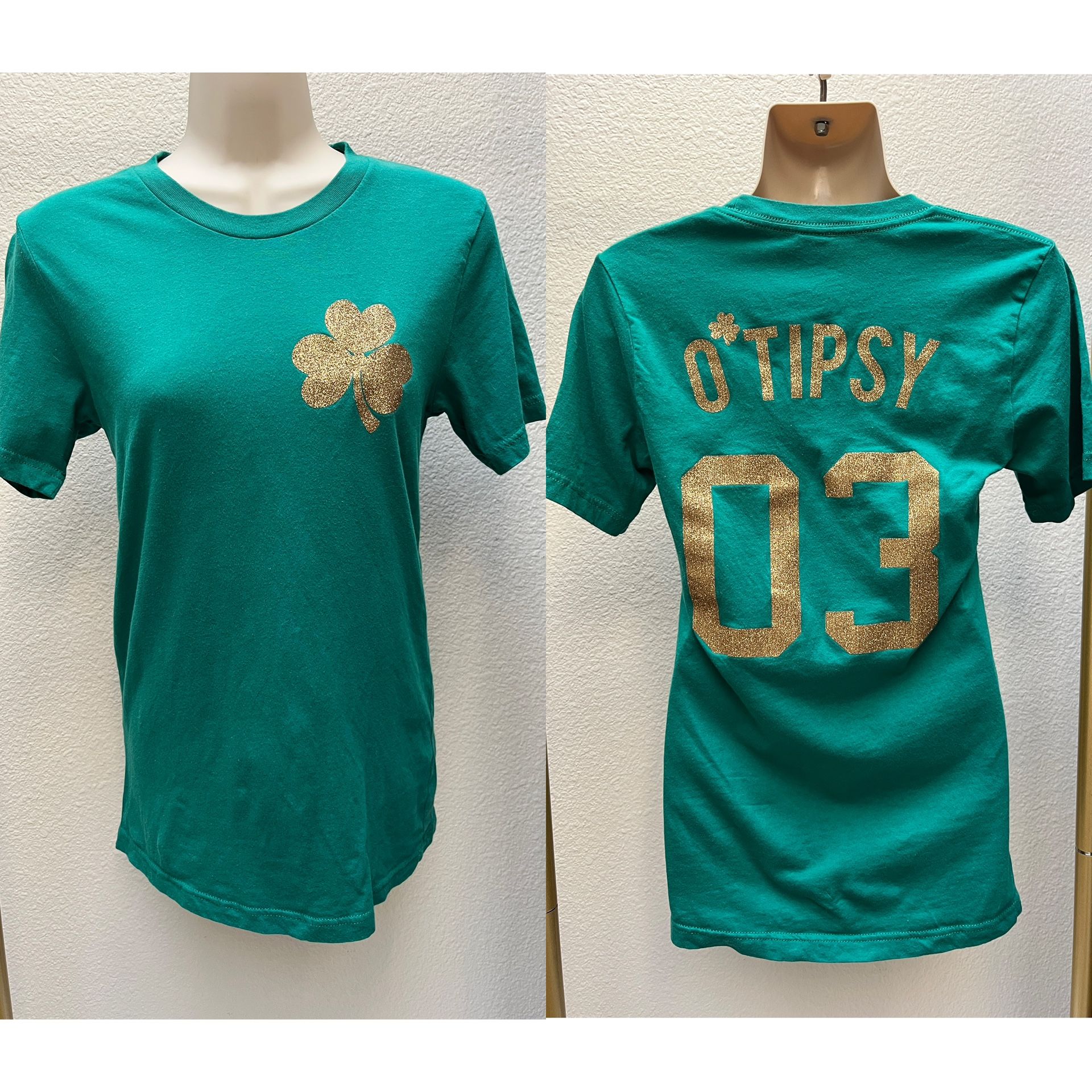 Celebrate St. Patrick’s Day with this t-shirt featuring a gold shamrock on the front and 'O'Tipsy 03' on the back. • Crew neckline • Short sleeve t-shirt • Gold shamrock and lettering on back are glittering Size: XS Color: Green/gold Measurements: 25” length, 14” shoulders, 15” bust, 8” sleeves Condition: pre-owned; good. Worn once. Washed and ready to wear. No rips or stains. Fabric: 100% cotton Pick up in Irvine near UCI from a smoke free home. Please ask all questions before buying, as all sales are final.