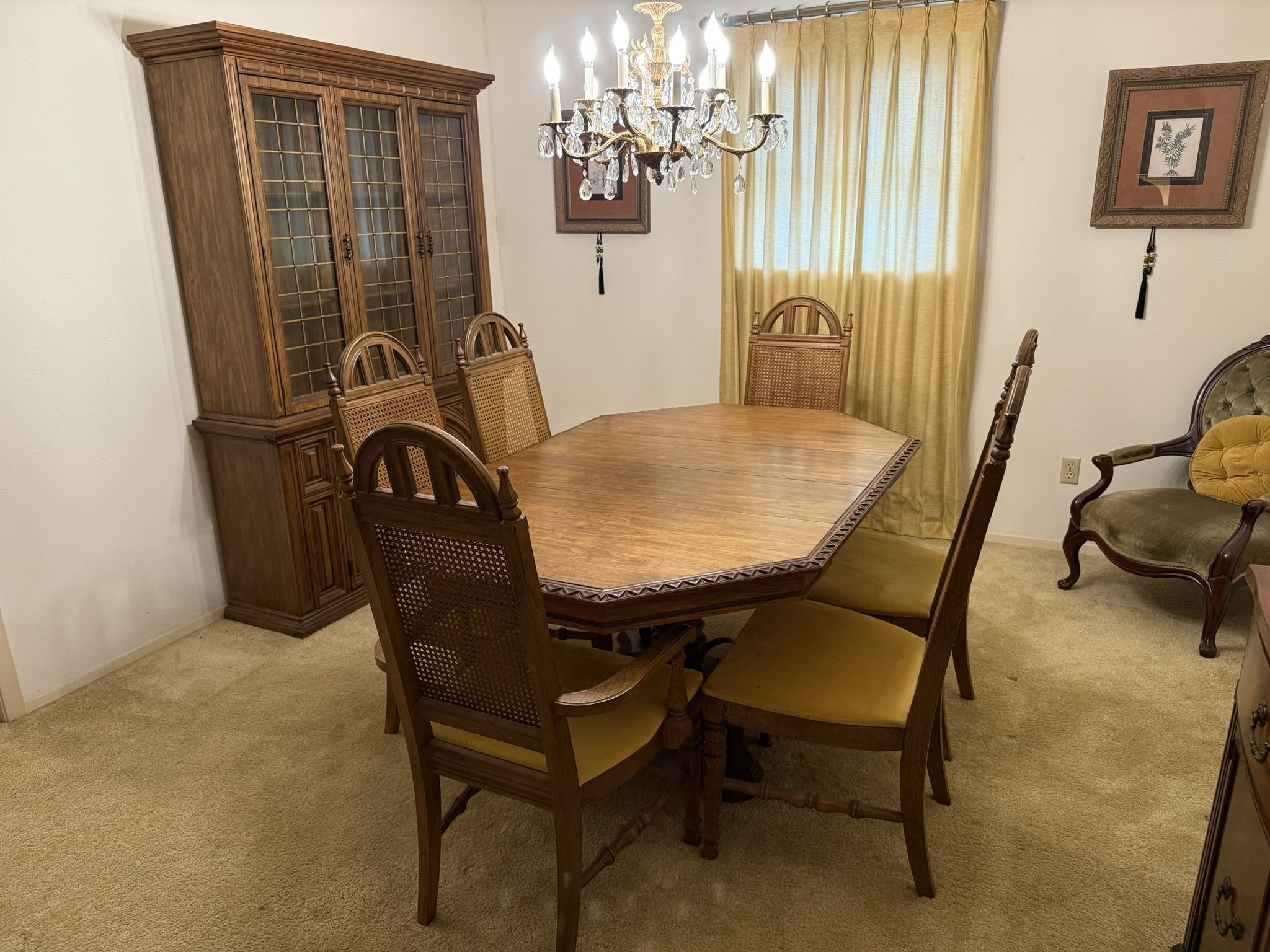 Vintage 1970s Dining Room Set for Sale This charming Bassett vintage dining room set from the 1970s is in excellent condition and has been lovingly cared for by one family since it was new; showing only minor wear considering its age. The set includes: - Six cane-backed chairs, including two armchairs - Dining table - Lit china cabinet The upholstery on the chairs could use a light cleaning or can easily be replaced with a fabric of your choice. Measurements: Dining Table: 44"W x 68"L (w/ two 12" leaves installed) x 32"T China Cabinet: 54"W x 79"T Arm Chairs: 23"W x 45"T Side Chairs: 21"W x 45"T All pieces are being sold together as a complete set. Don't miss the chance to own a timeless vintage dining room ensemble! Contact for additional details or to arrange a viewing.
