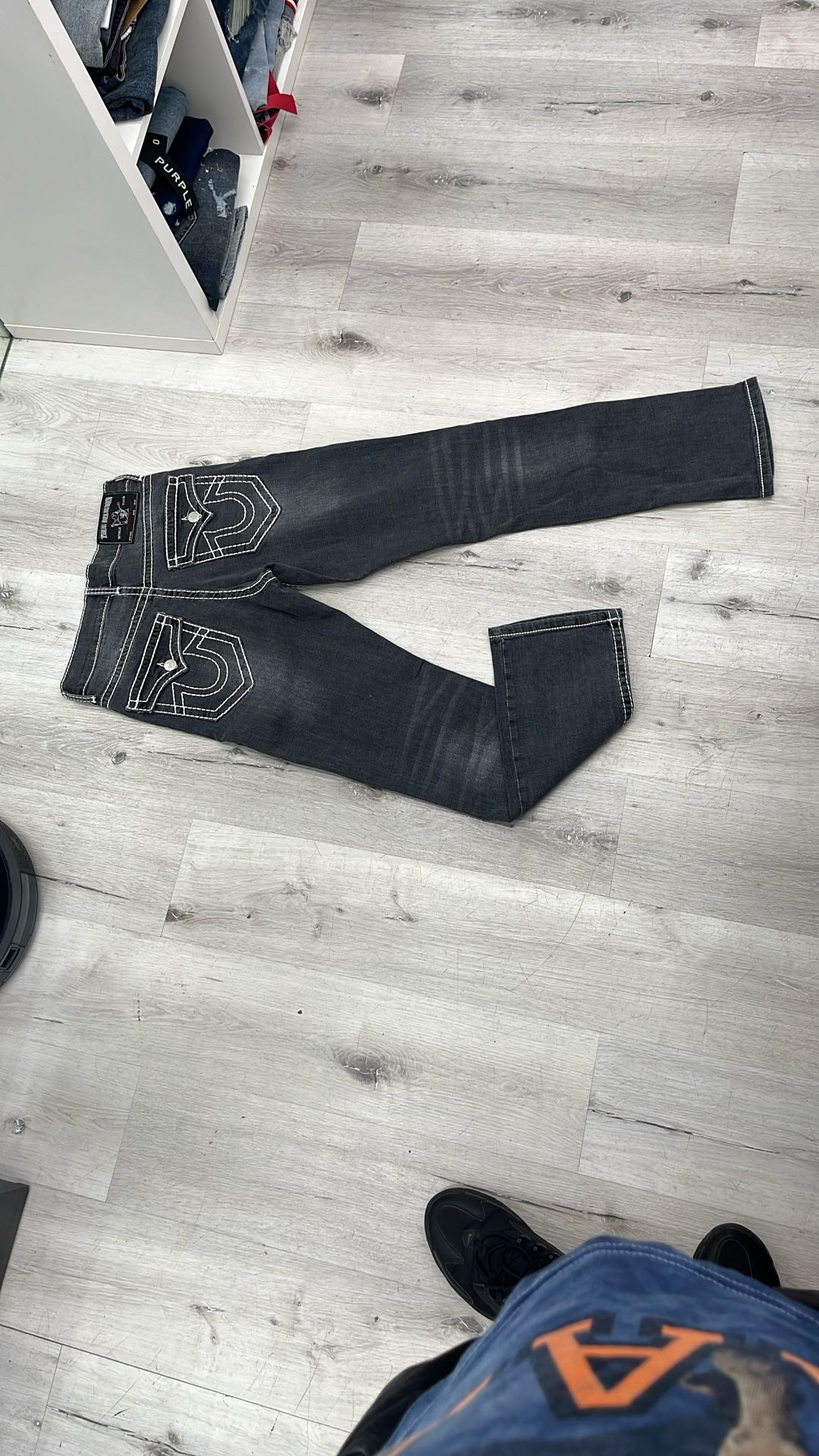 These grey True Religion jeans feature a rugged, modern wash with bold white contrast stitching that defines every seam and pocket. Crafted in the USA, they include the signature horseshoe-embroidered coin pocket and metal button detailing with True Religion branding. The faded whiskering across the thighs and subtle crease lines give them a worn-in, vintage look while keeping a sleek silhouette. These jeans strike a balance between streetwear edge and premium denim craftsmanship, making them a standout piece for casual or elevated urban outfits. Size shown is 30 - 38