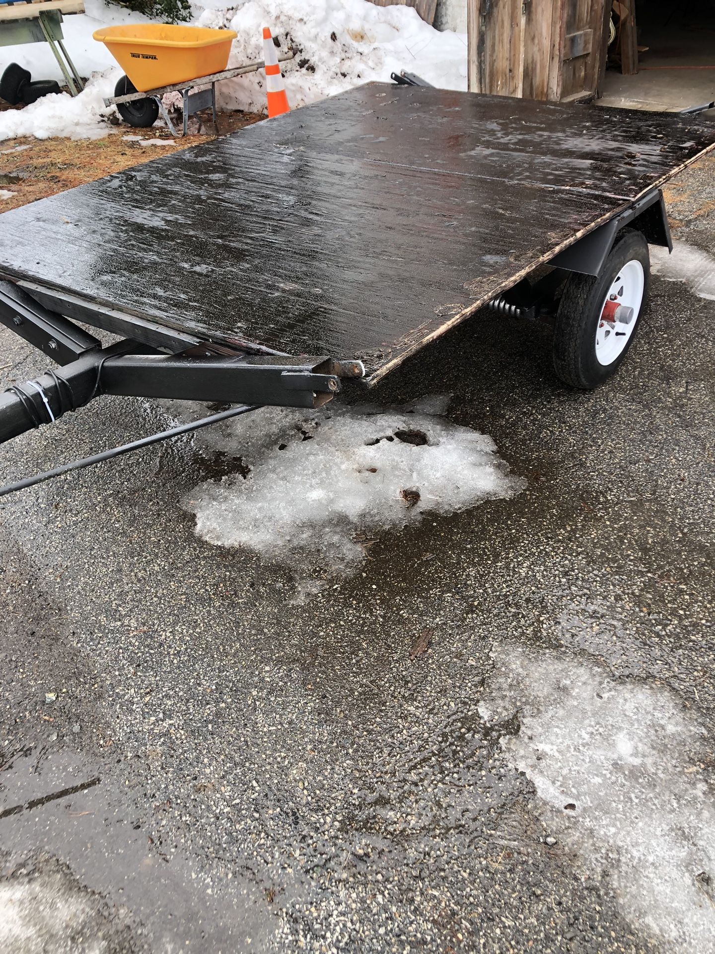 For sale is a utility trailer . 5’-7” x7’4” long . 9’ foot tongue . New tires , bearing kits , rims . New magnetic removable lights with a 7 way plug . New 2” coupler and new swing jack . 30 miles on tires . Toes easy & strait . Great for mower or drive on drive off snowmobile with a added front angle deck . 3/4 “ plywood dr Kong . Torsion bar axle .