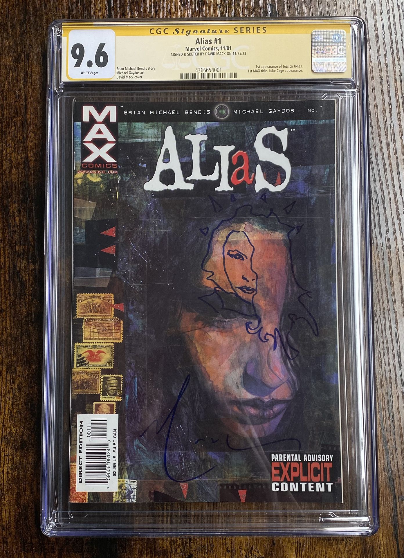 Alias 1: First App of Jessica Jones. This is a CGC 9.6 signed and remarked by David Mac. Please if you have any questions or concerns feel free to message me. Open to offers.