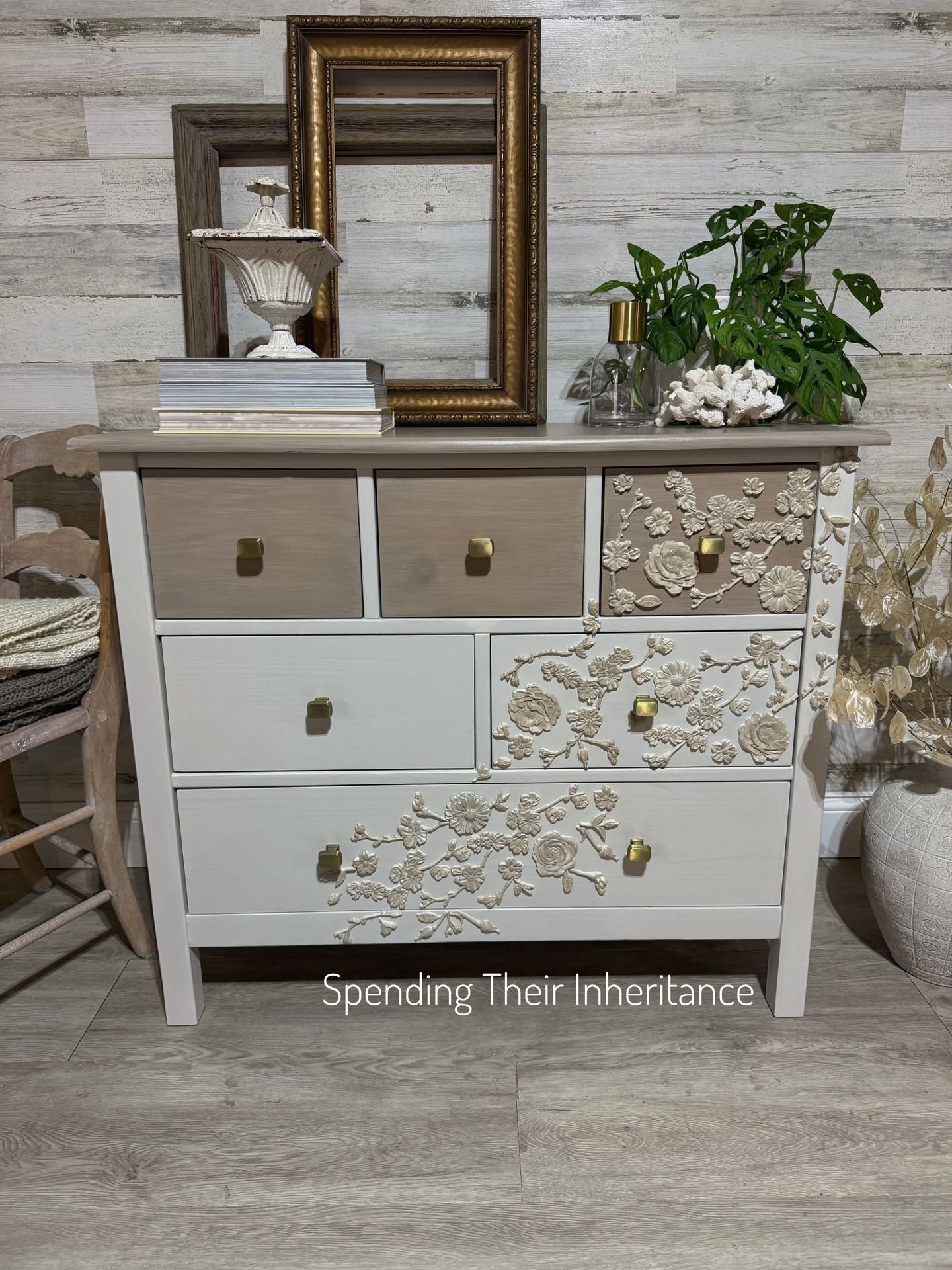 Beautiful Pottery Barn wood dresser with beautiful dimensional flowers. Six dovetailed drawers are clean, function well and beautifully lined. 38”w x 18”d x 33”h Pet and smoke free. Delivery available for a fee.
