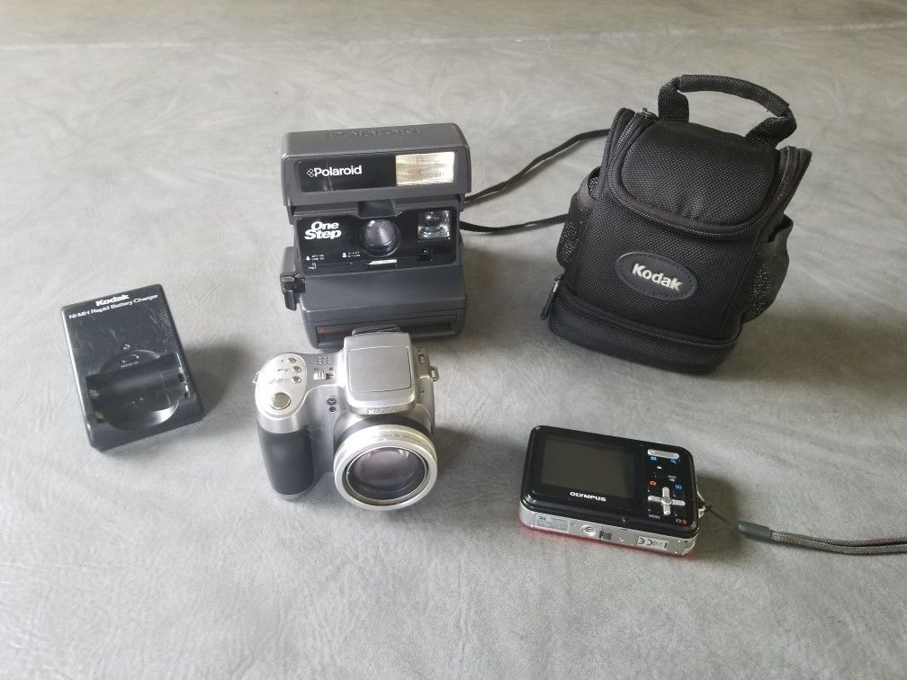 Three cameras: Polaroid one step instant camera, Kodak Easy Share Z740 with case and rapid battery charge, and Olympus 10 megapixel x 560wp. I don't know the history except the pricing on ebay. $30 or best reasonable offer