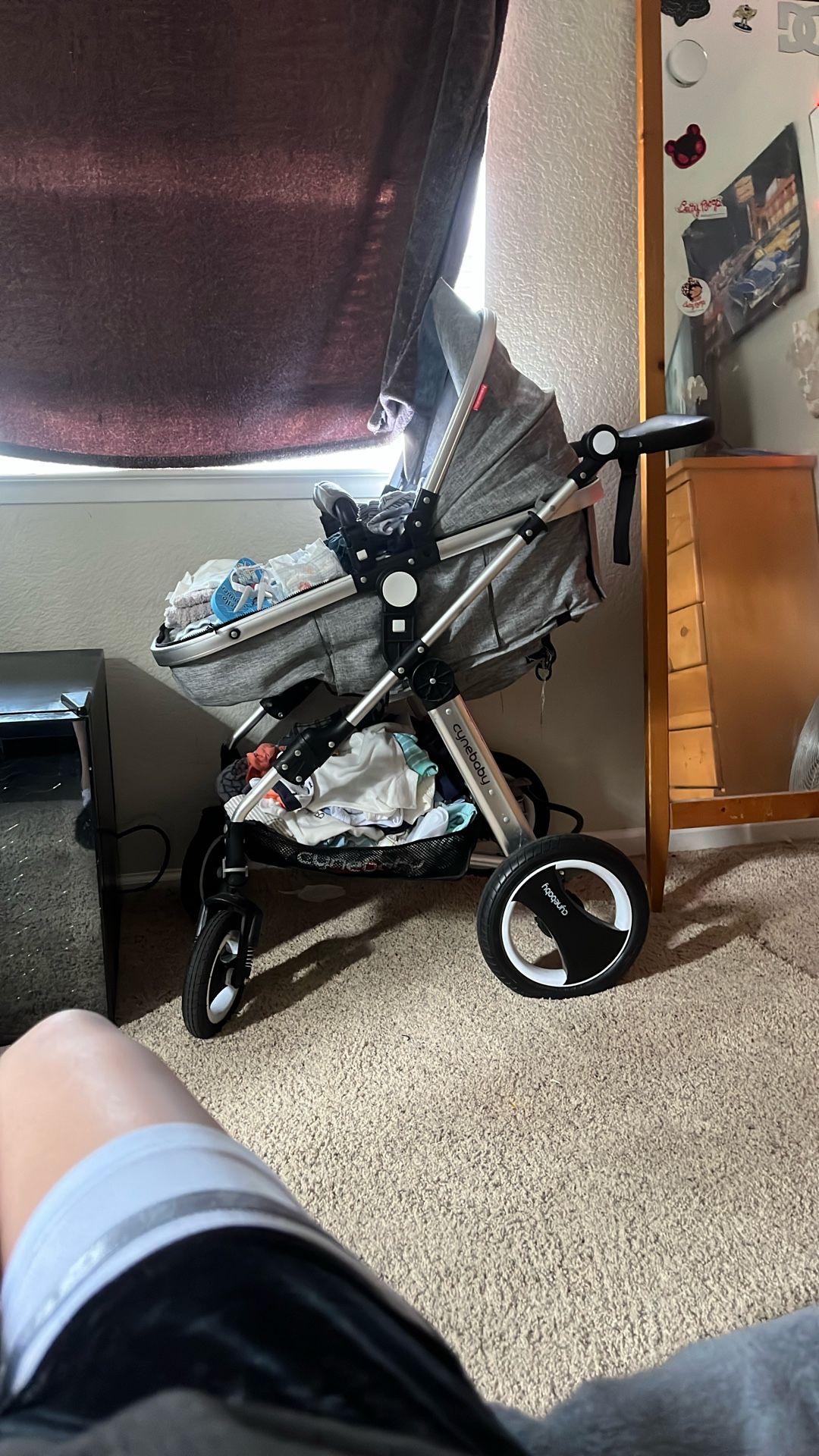 Filled with brand new baby boy clothes 0-3 months. The stroller is slightly used looks new. Also comes with a chest baby holder.