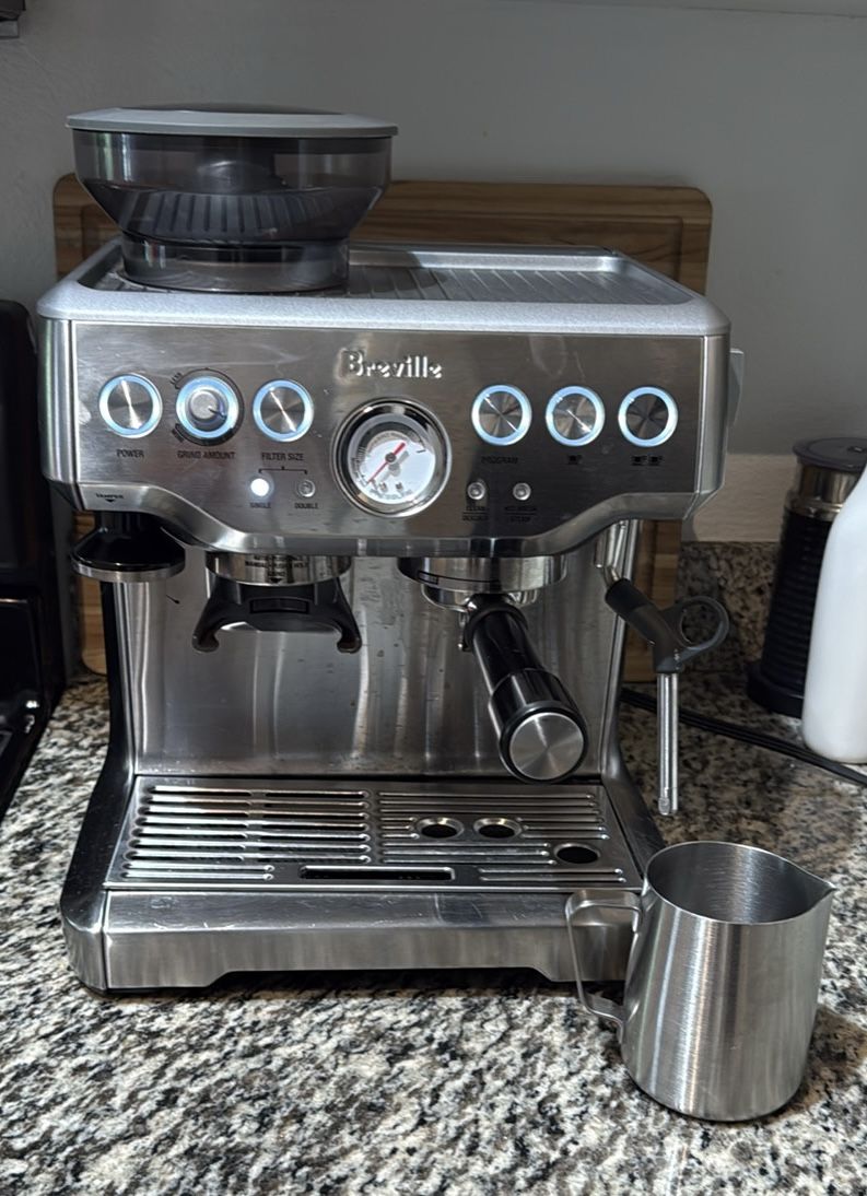 Well maintained Breville Barista Express Comes with: Metal Espresso Level Milk Frothing Pitcher Portafilter Reason for selling is the grinder turns on fine but isn’t grinding beans throughly, it might just need a deep clean or burr replacement. Will deliver for $10