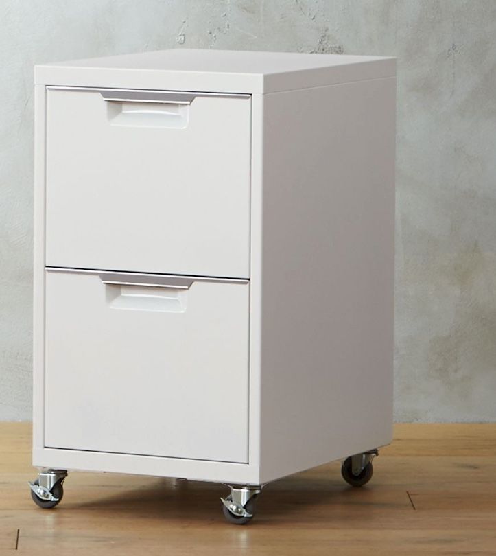 CB2 filing cabinet totally perfect storage. Durable steel sheet construction with stainless steel handles -White powdercoat finish -Two letter-legal file drawers -Four 2 casters; brakes on two front casters. Matching desk is available for sale.
