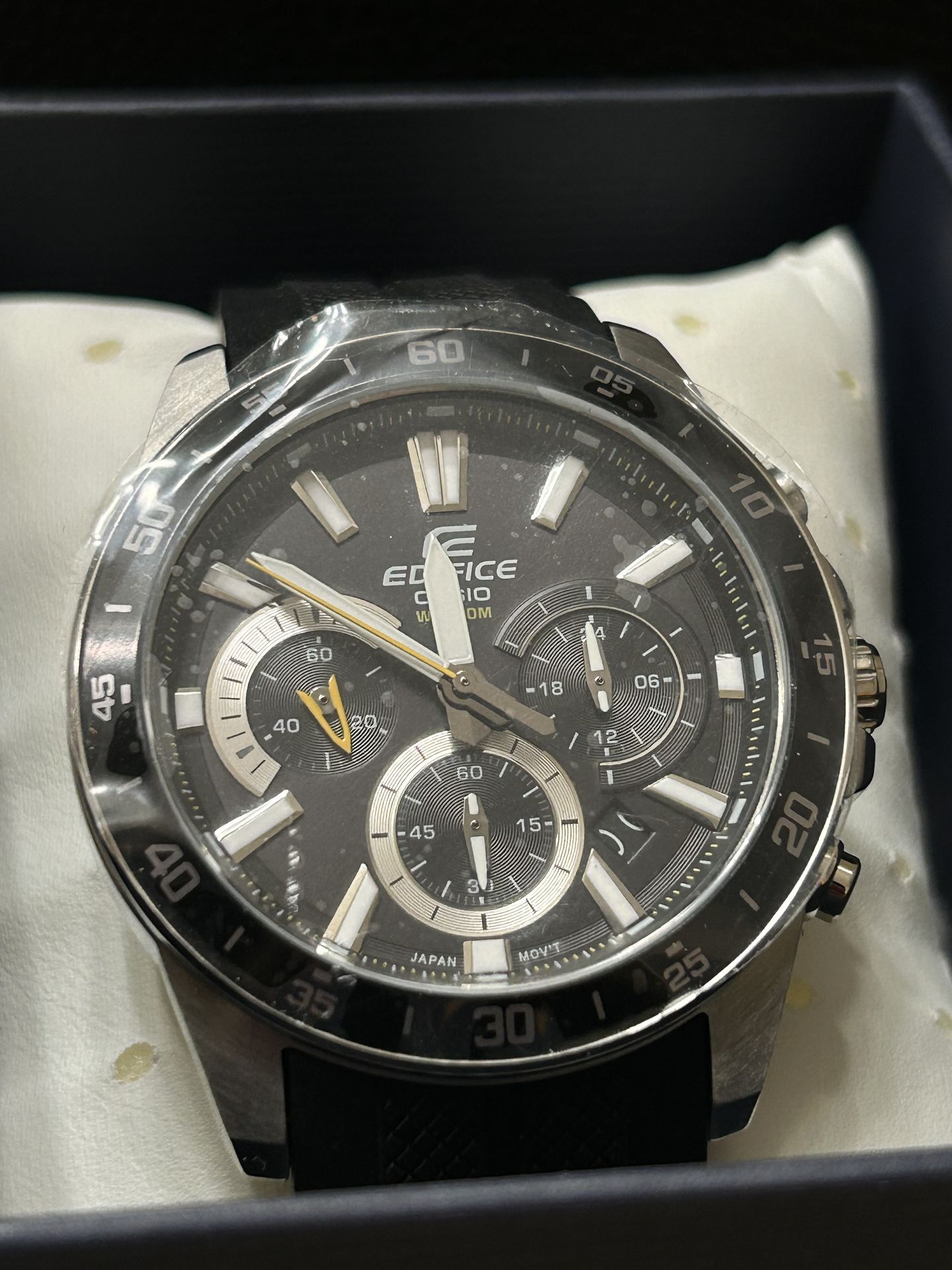 Casio Edifice Chronograph in excellent condition. Sporty and elegant design with black dial and stainless steel case. Comes with original Edifice (Casio) box as shown in photos. This model features a chronograph function with multiple subdials and a bold tachymeter-style bezel. Perfect for daily wear or a stylish sport look. πΉ Brand: Casio πΉ Model: Edifice πΉ Water Resistance: 100M πΉ Chronograph Function πΉ Black Dial with Silver Subdials πΉ Stainless Steel Case πΉ Black Resin/Rubber Strap πΉ Date Display πΉ Japan Movement πΉ Includes Original Box The watch is in very good condition with minor signs of handling (see photos). Crystal appears clean and clear. Feel free to message me with any questions.
