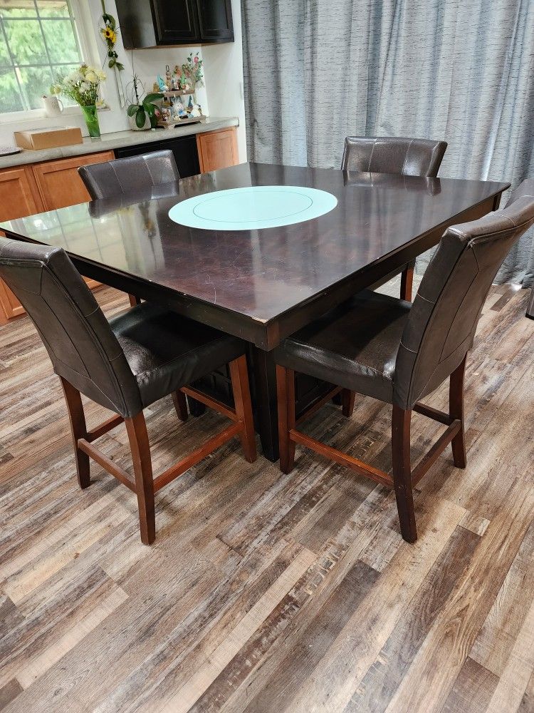 Countertop height table and 4 chairs. Used and has a few scratches. Top glass piece is lazy susan. Has storage for wine glasses and wine underneath in cabinet.