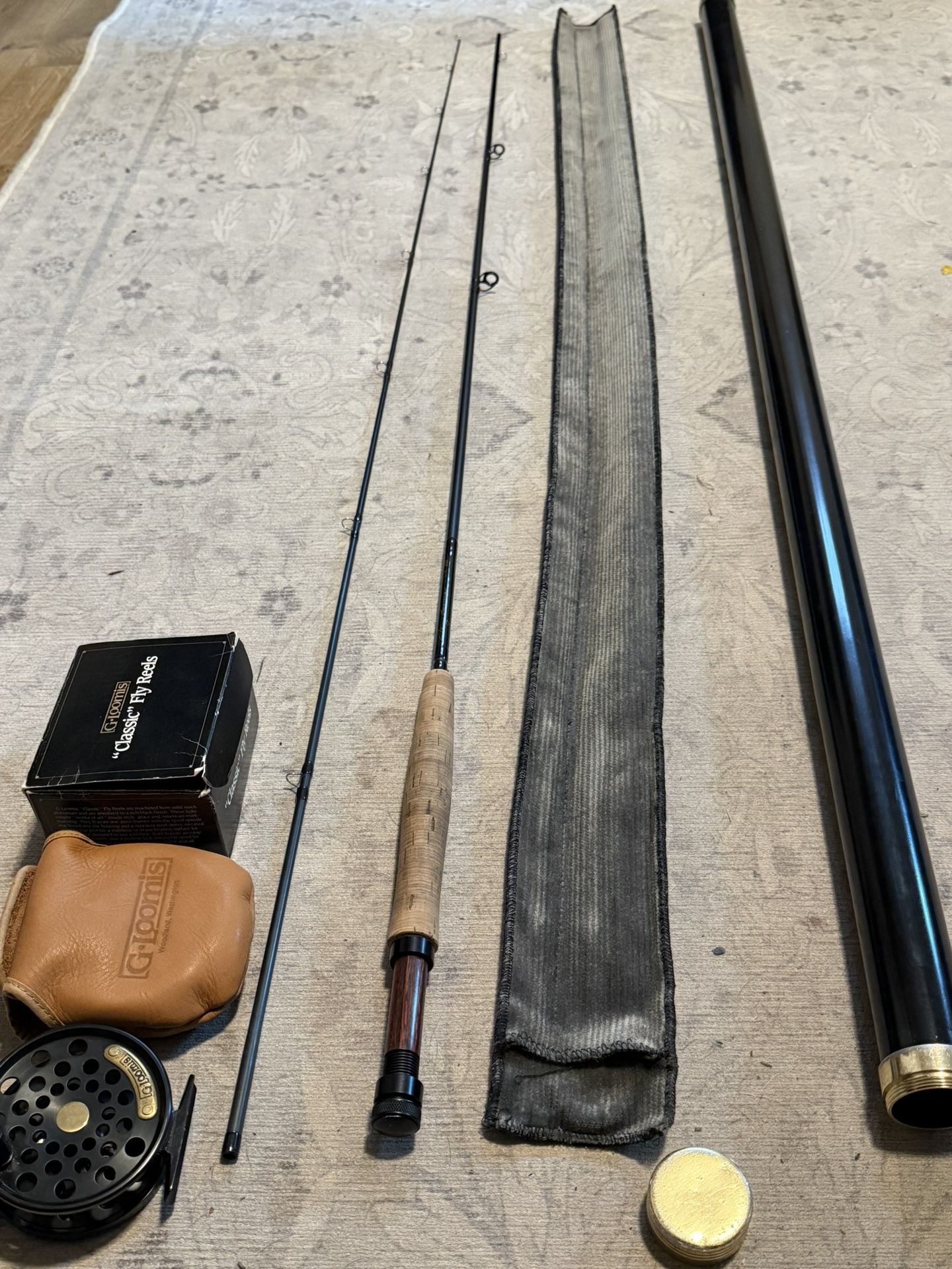 Gary Loomis 9 foot fly fishing rod #6, soft case, hard case plus reel. Hard case is signed by Gary Loomis and rod in gold letters you’re not gonna find this anywhere Reel is model 678 classic fly reel made in Argentina so it’s the real deal and hard to find for sure! Comes with brown leather pouch and original box Fly rod has red woodgrain , cork handle. model is IMX , # 6