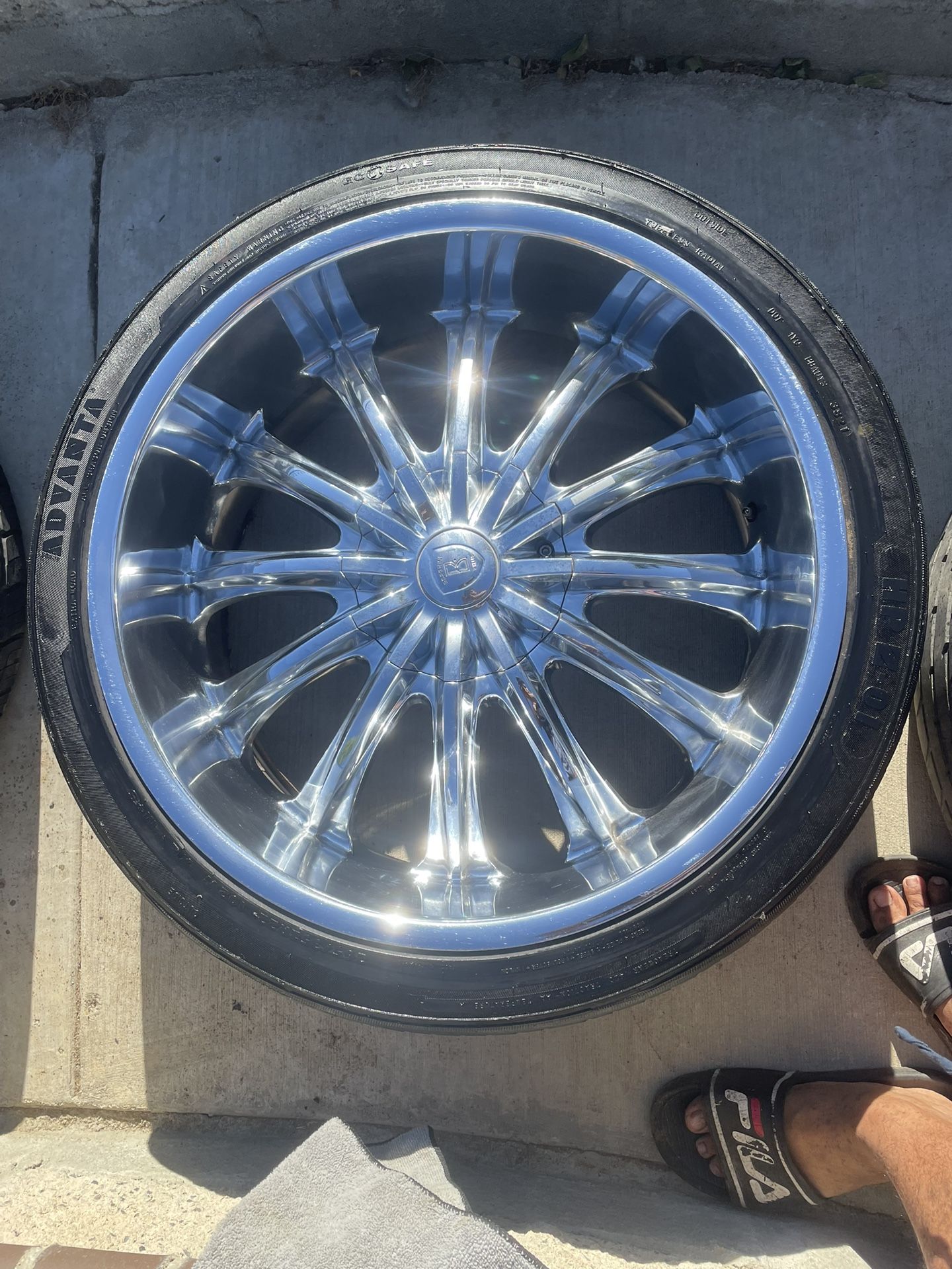 22 inch All the information is in the pictures Got all 4 rims ,Just 1 of them needs a new tire Besides that just a few scratches and stains Not in a rush to sell , will ignore lowballers