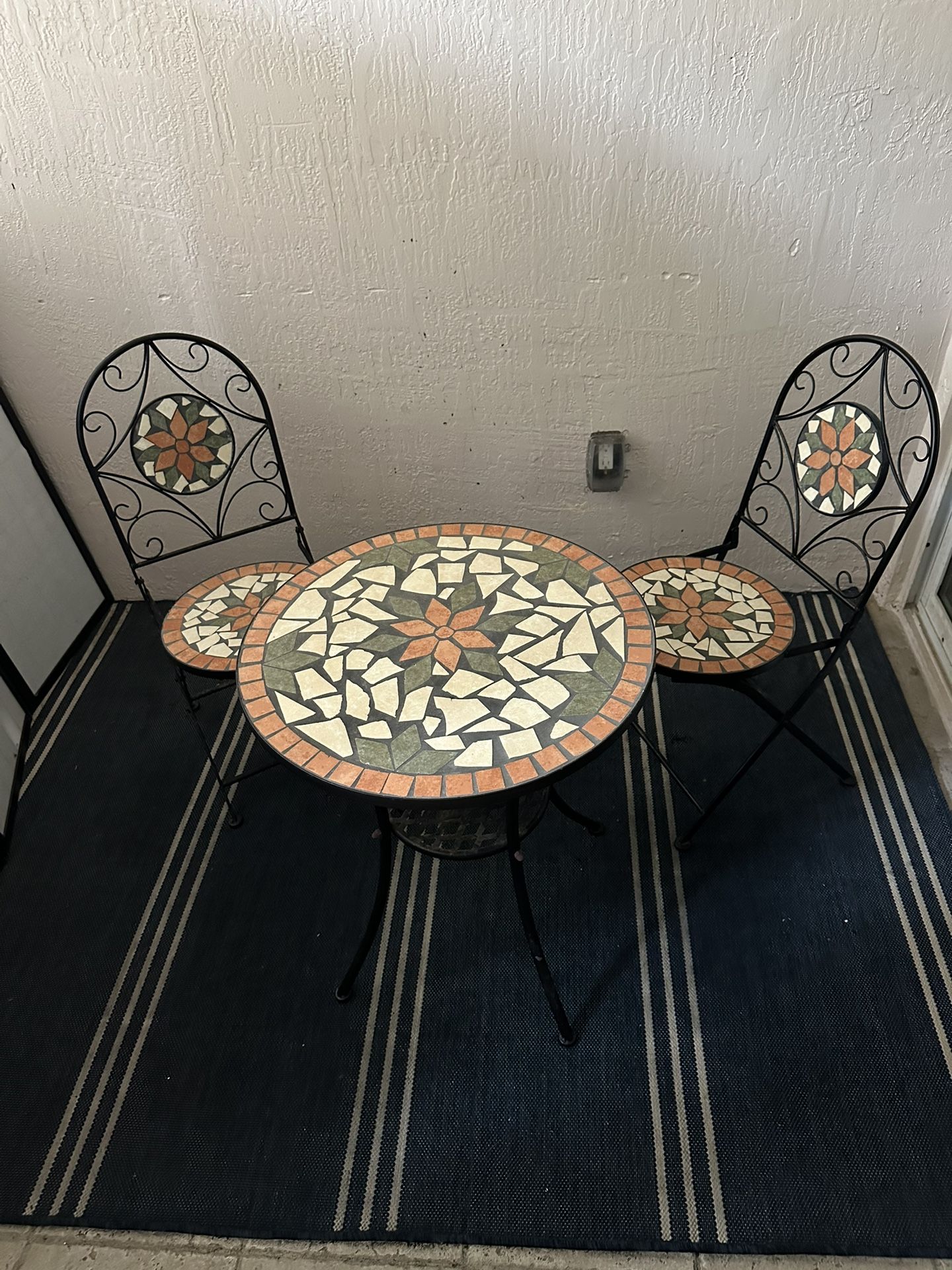 VINGLI 3 Pieces Garden Patio Mosaic Table, Outdoor Bistro Set with Folding Chairs,Black Iron Frame - Great Condition - Comes with a 5ft x 7ft Navy Blue Patio Rug (buyers choice) Currently in the process of moving so first come first serve!