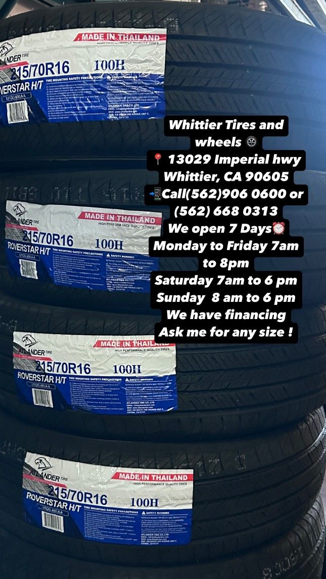 WHITTIER TIRES 13029 IMPERIAL HWY WHITTIER CA 90605 CALL (562)906-0600 TEXT (562)413-6926 - WE HAVE THE BIGGEST USED & NEW TIRE INVENTORY AVAILABLE, ASKS US FOR ANY SIZE YOU NEED. FINANCING OPTIONS AVAILABLE, 90 DAY NO INTEREST! HABLAMOS ESPAñOL. OPEN MONDAY-FRIDAY 7AM-8PM, SATURDAY 7AM-6PM, SUNDAY 8AM-5PM 185/65/14 175/65/15 185/55/15 185/65/15 195/65/15 205/55/16 215/55R16 215/60/16 205/65/16 245/75/16 265/70/16 285/75/16 265/75/16 215/45/17 225/45/17 225/50/17 215/50/17 215/55/17 235/65/17 245/65/17 255/65/17 265/70/17 285/70/17 33x12.50r17 215/45/18 225/40/18 235/40/18 235/45/18 245/45R18 235/60/18 245/60R18 265/60/18 255/70/18 265/70/18 33x12.50r18 225/40/19 235/40/19 245/40/19 245/45/19 245/35/20 245/45/20 245/50/20 255/50/20 265/50/20 275/55/20 275/60/20 33x12.50r20 35x12.50r20 37/13.50R20 265/35/22 285/45/22 305/40/22 305/45R22 33x12.50R22 295/35/34 305/35R24 ESPECIAL DE LLANTA NUEVA Y USADA GOODYEAR MICHELING BRIDGESTONE FIRESTONE CONTINENTAL ARROYO YOKOHAMA PIRELLI KUHMO TOYO ATLANDER LANDGOLDEN LANDSPIDER LLANTAS TIRES WHEELS