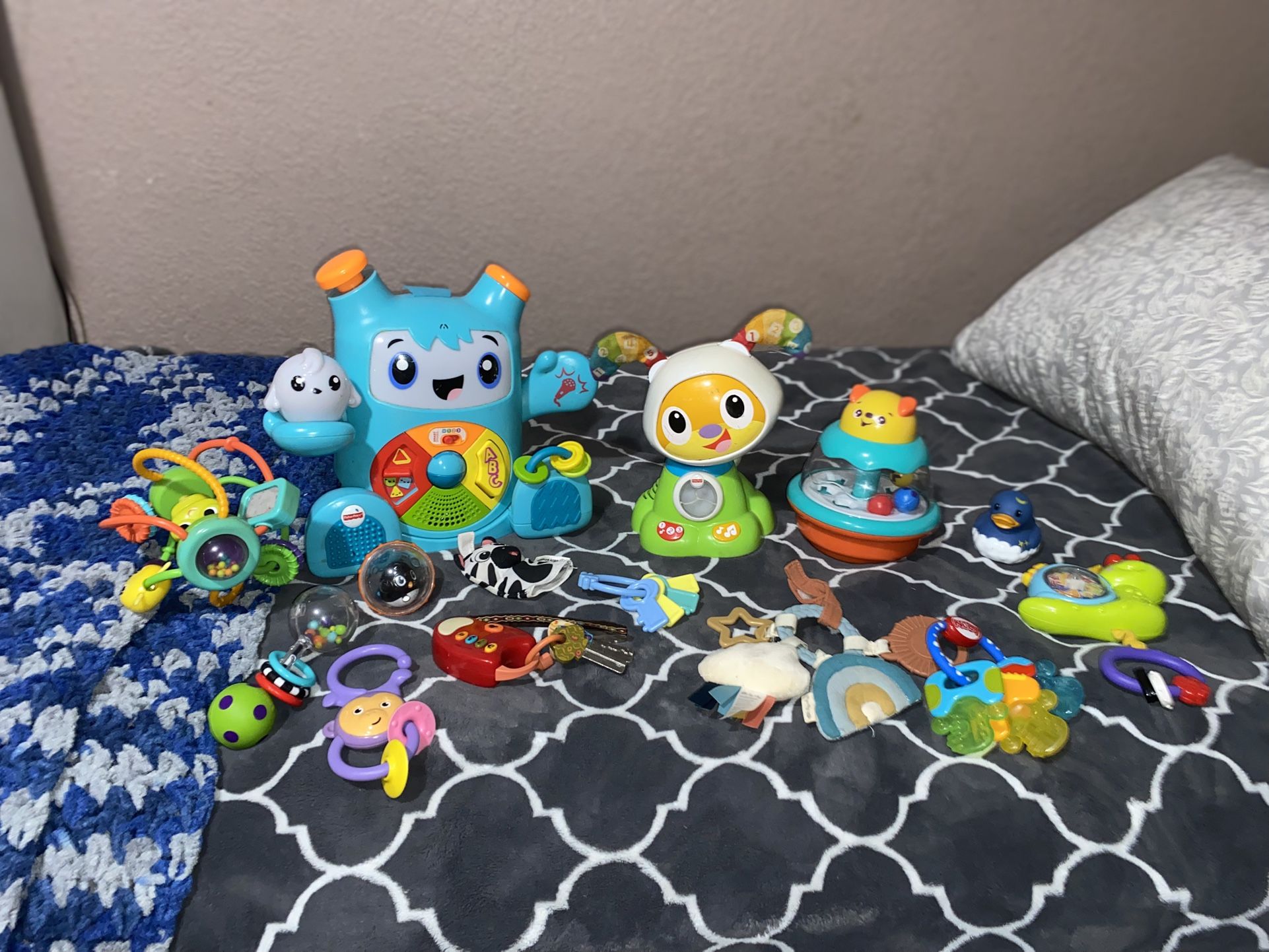 Baby toys gently used For baby boy or baby girl All toys that turn on, work great The big blue toy records your voice and plays it back to you as well as many other features Asking $15 or best offer for all 14 toys shown in photo