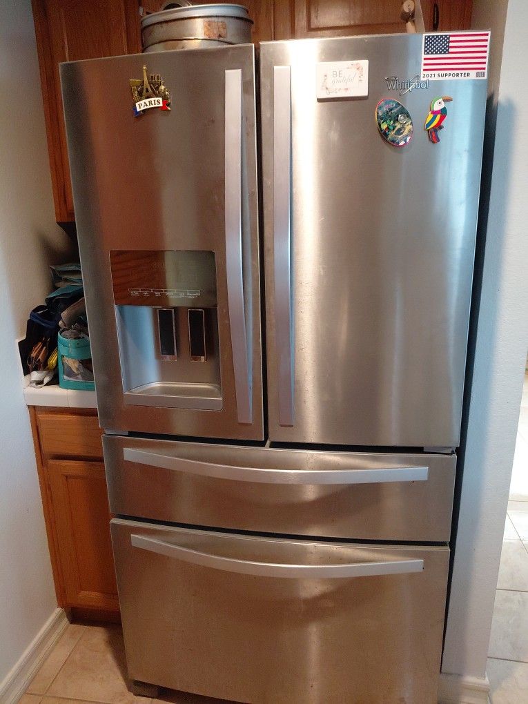 Whirlpool stain steel with ice maker 4 door frige. Good condition lots of space. 70 inch high W 3 feet, Deep 31 inches .
