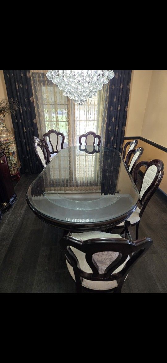 Dining Table with glass inserts and custom made glass cover. Surface is wood. Made in Italy. 55" wide. 72" to 94" long with expanding insert. ( full size will seat 8). Great condition.