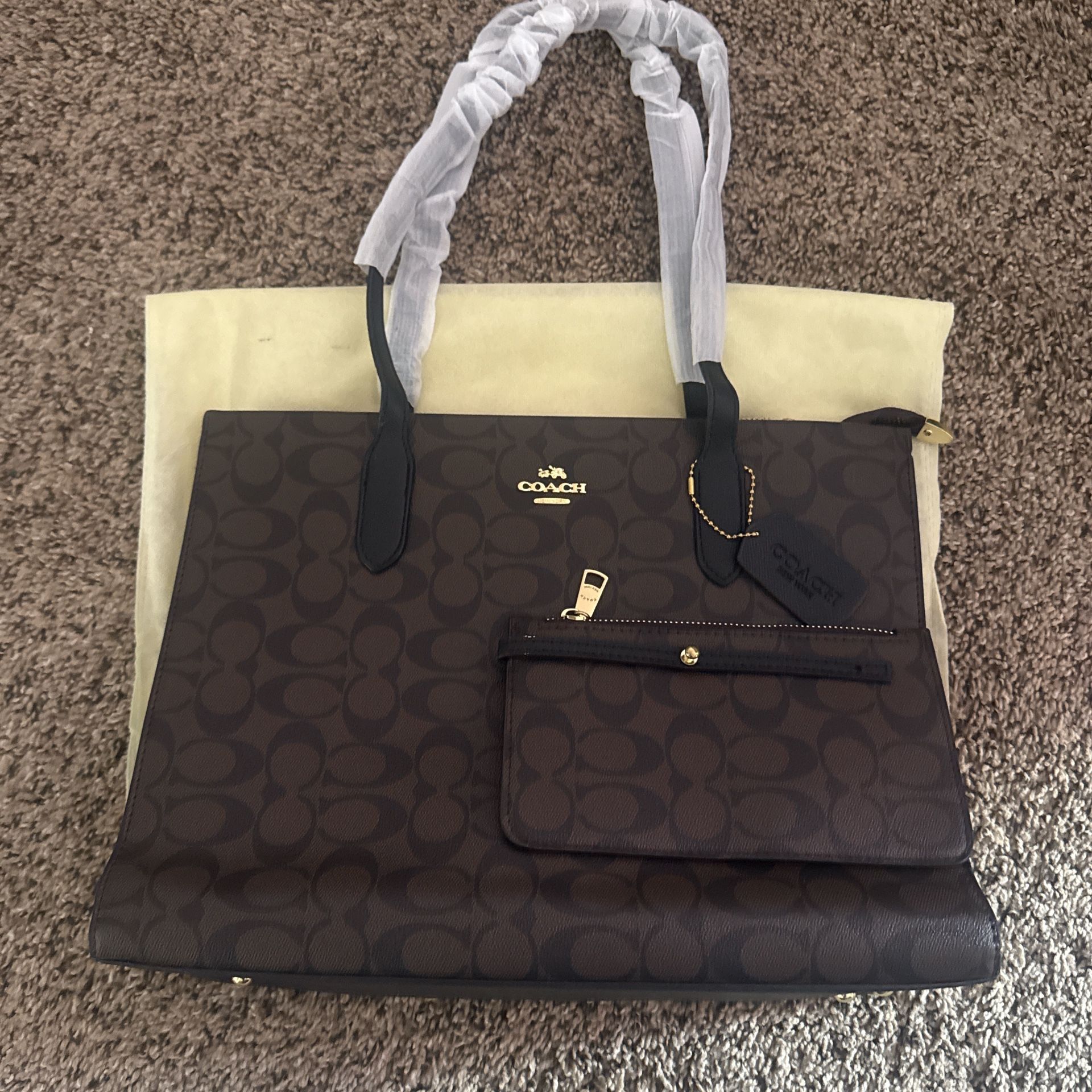 Brown Coach tote bag with zipper closure, featuring two pockets and a detachable pouch. Will also come with dust bag!! 💼✨