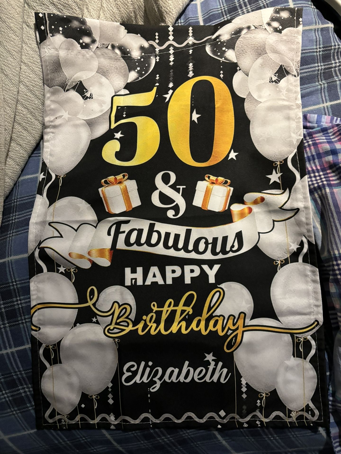New. My mom ordered it for my 50th birthday . It came with wrong name on it. Do you know an Elizabeth turning 50? Maybe she’ll love this banner/flag