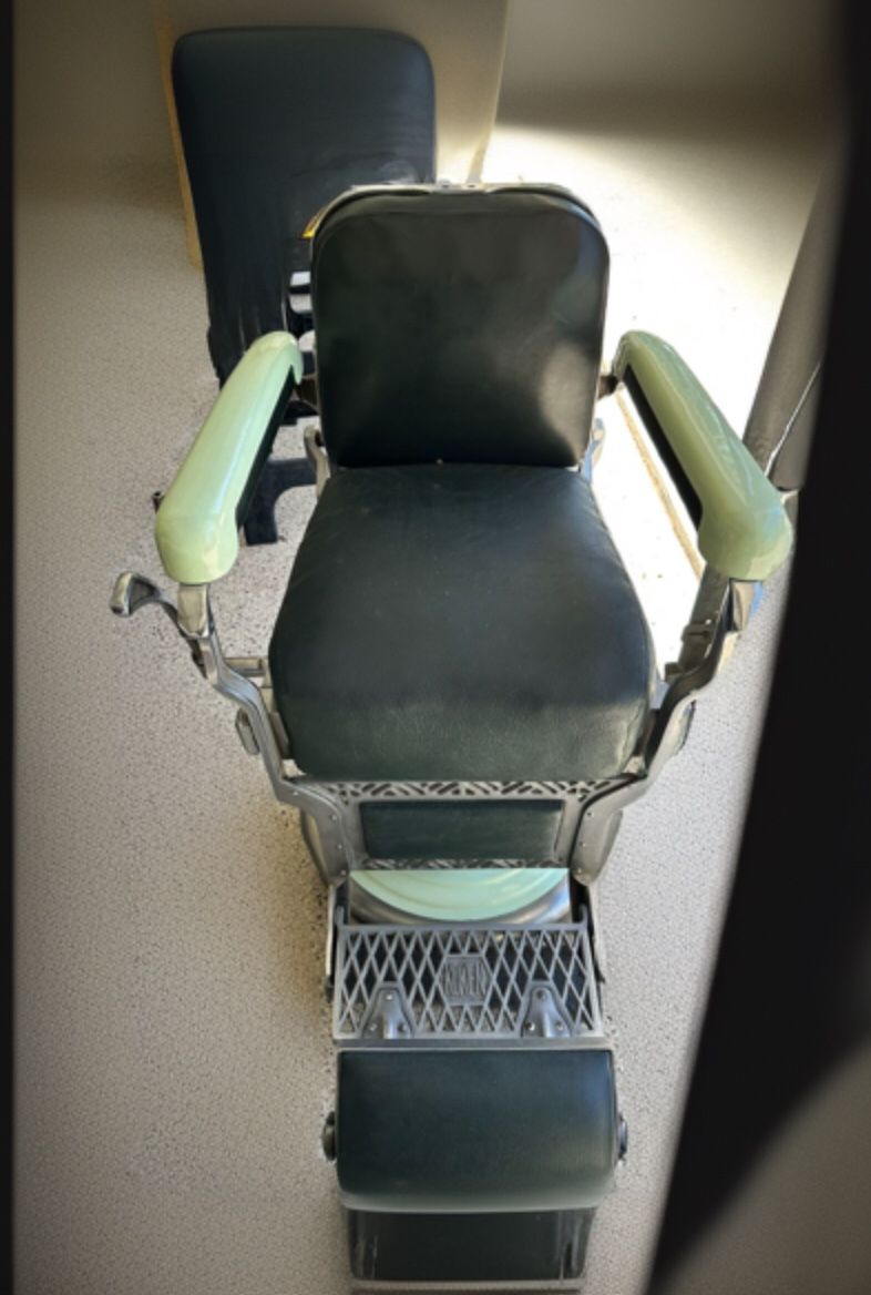 🔥 Rare Antique Koken Barber Chair – Mint Green Porcelain – Fully Functional 🔥 📍 ONLY ONE LEFT – the tan chair is SOLD! Up for grabs is a rare and stunning Koken antique barber chair in mint green porcelain – one of the hardest colors to find. This chair is a true piece of history, designed in the 1950s era with sleek lines inspired by bullet trains and airplanes of the time. ✨ Features: • Original mint green porcelain – highly sought after color • All functions work perfectly: recline, hydraulics, lock, swivel • Chrome is in great condition for its age • No cracks, no major damage – very well preserved • A true collector’s piece These Koken chairs are not just functional, they are museum-worthy statement pieces that elevate any barbershop, man cave, or vintage décor setup. ✅ The tan chair pictured has already been sold – this mint green beauty is the last one available! 💰 Serious buyers only – chairs like this don’t come around often.