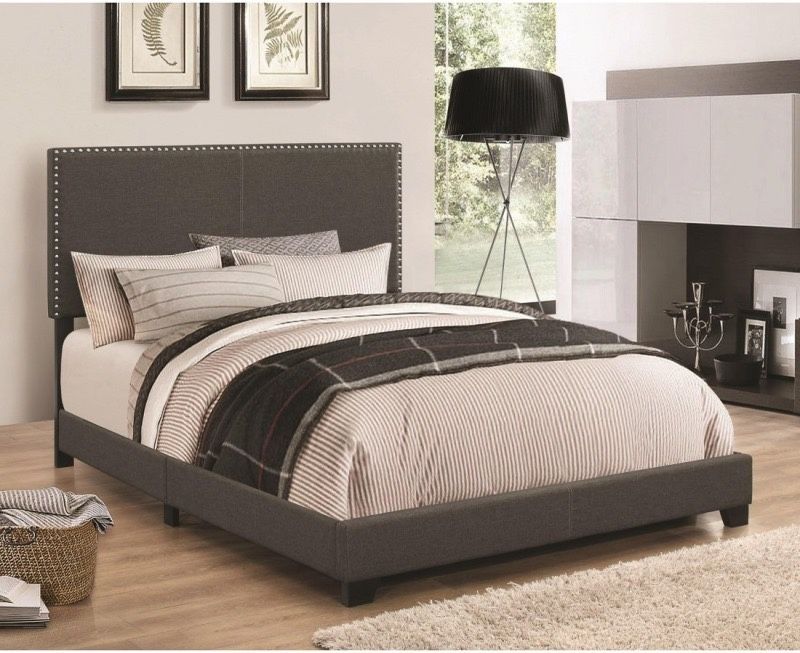 Charcoal Fabric with nail head trim Twin: $150 Full: $175 Queen: $195 King/Cal King: $225 Best Prices in the Industry Guaranteed! (Mattress Not Included) *No Tax *Pickup in Tracy by Appt *We Can Deliver