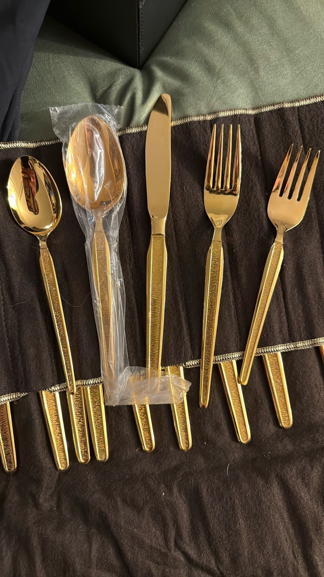 Not sure of the manufacturer, gold plated SS Very minimal use if any. Small scratches from other pieces they are stored with. Cloth storage rolls included 20+forks 20+Sm spoons 20 large spoons 12 knives