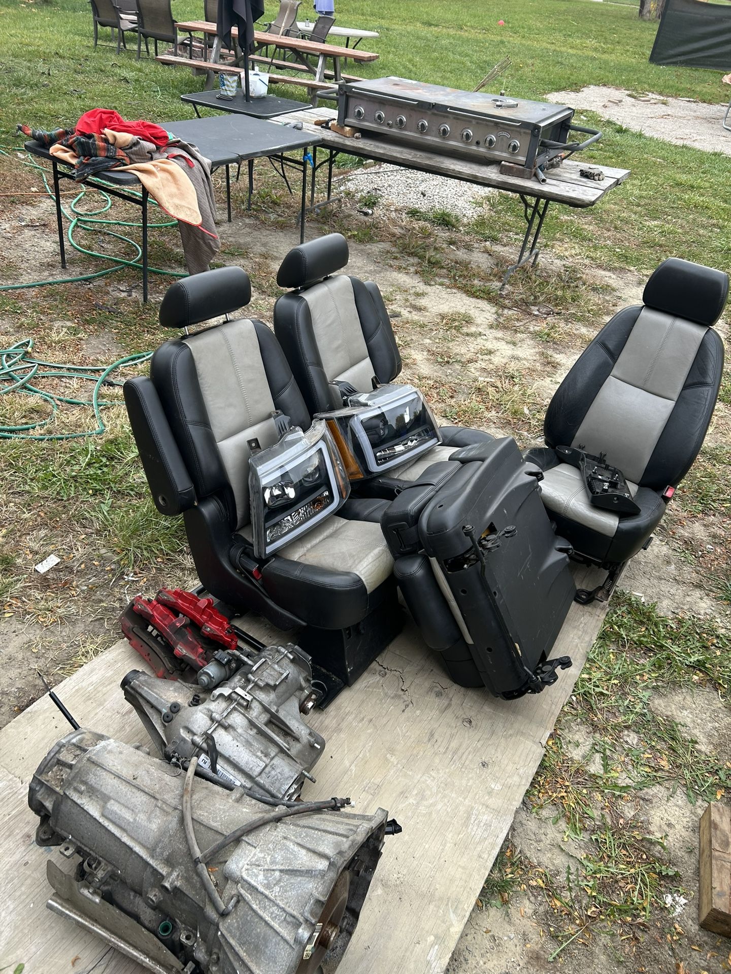 550 selling trans 6L80E with transfer case . Trans shifts great! 500 for rims could use some cleaning calipers broke and left break dust on them . 100for headlights 300 for seats Wasn’t able to pull out the drivers seat and last rear roll out seat .. As is pick up today Tires sold , trans sold … only things left are transfer case , headlights , seats and front calipers