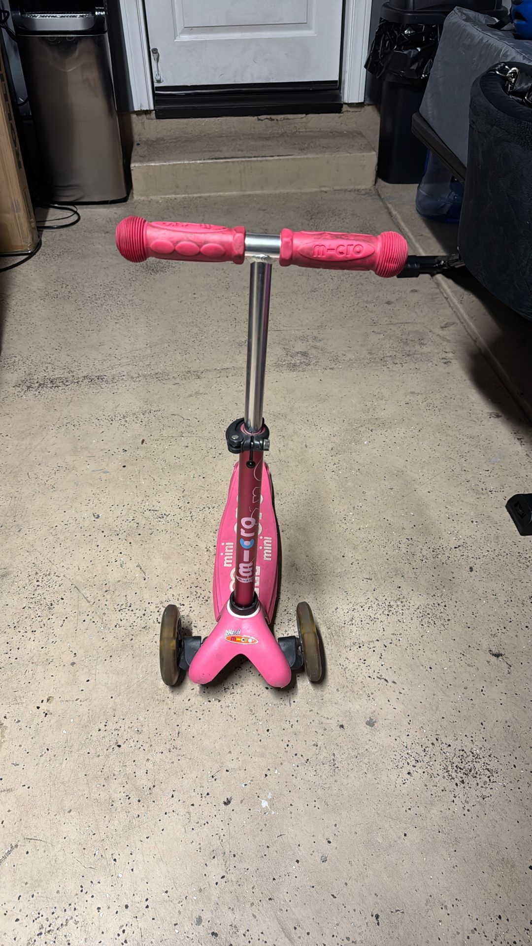 Gently used Micro Mini Deluxe LED Scooter (pink with white light-up wheels) — great condition with normal wear and tear from regular use, but works perfectly. My daughter outgrew it so we’re passing it on to a new rider! This lightweight, kid-friendly scooter features motion-activated LED wheels that light up as your little one scoots (no batteries needed!), easy lean-to-steer balance steering, and an adjustable handlebar that grows with your child. It’s perfect for ages roughly 2–5 years and supports riders up to about 110 lbs.  Dimensions: • Deck: about 12” x 4.5” • Scooter length (approx): 21” • Handlebar height adjusts from about 17”-25” • Wheels: 120 mm front / 80 mm back • Scooter weight: ~4.2 lbs  What’s included: • Pink scooter with white light-up wheels • Adjustable handlebar Condition: • Light scuffs/scratches from normal riding • Wheels and lights still work great • Ready to ride! Feel free to message