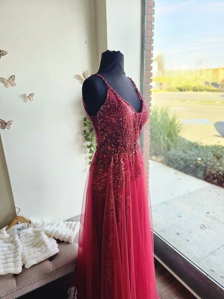 Burgundy beauty A line beaded - with glittery sequin design, it has georgeous details all over neckline and waistline. also features a sheer overlay that discretely gives a glimpse of the front slit. The corset closure also allows to play between sizes. * Originally purchased for $425*** / Used once, it has a few beads missing. Size XL Measurements: Bust 38-40", waist 34", hips 42-44"