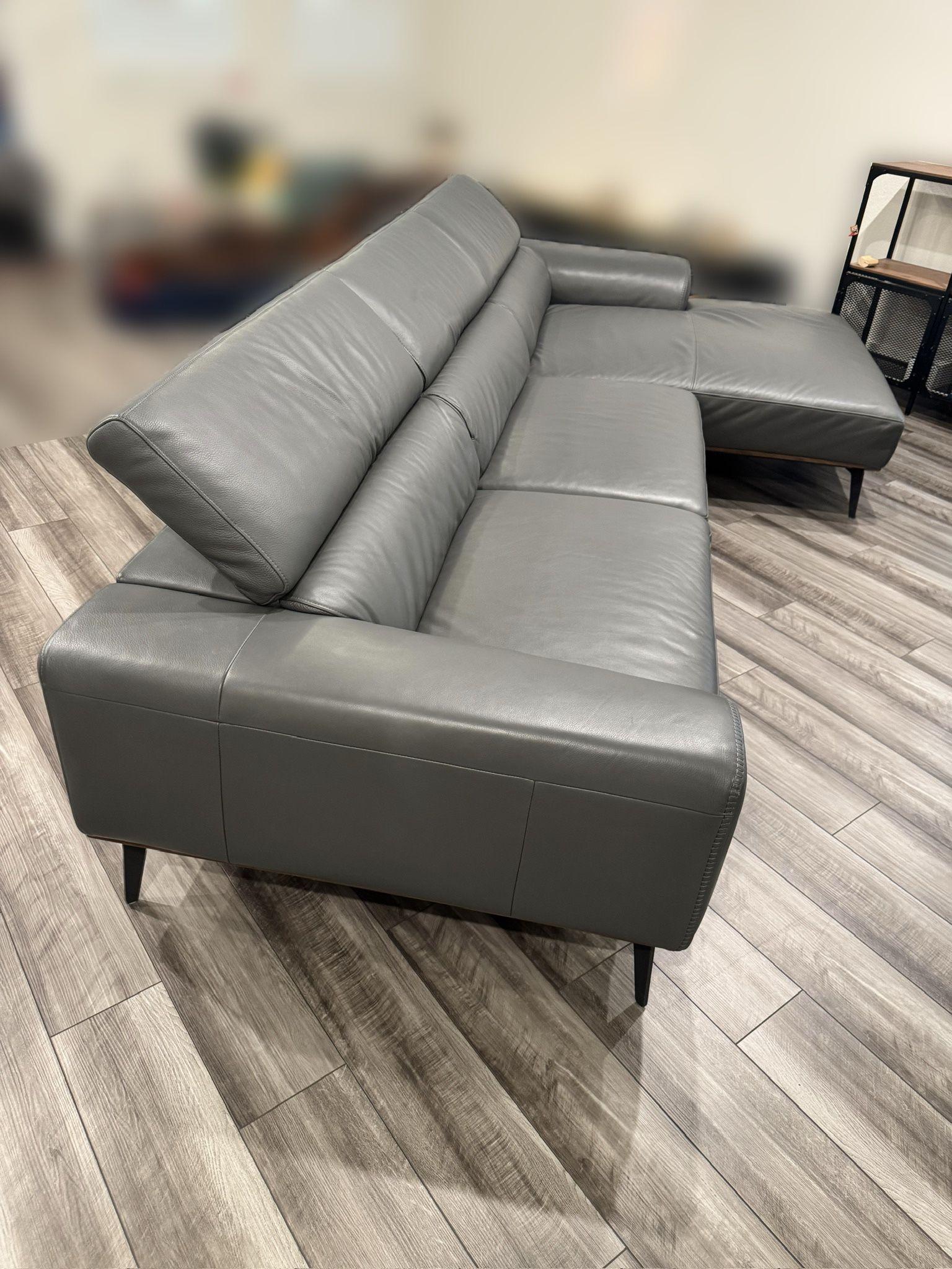 Premium Italian leather sectional from Copenhagen. Sleek slate grey color with adjustable headrests. Great modern style and very comfortable. Condition: Excellent. No rips, tears, or stains. Smoke-free home. Dimensions: 128 in x 66 in x 40 in (details in pictures) Retail Price: Paid over $3k new. Asking $1,750 OBO. Cash, Zelle, or Venmo only. You must pick up in Southeast Austin.
