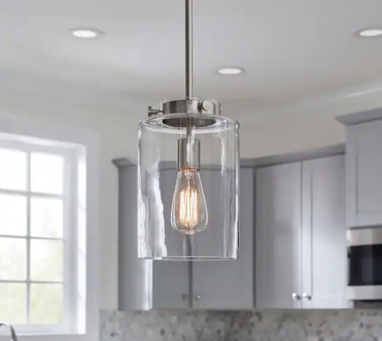 Mullins 6.75 in. 1-Light Brushed Nickel Mini Pendant with Clear Glass Shade There are more boxes and negotiable to get a better deal.