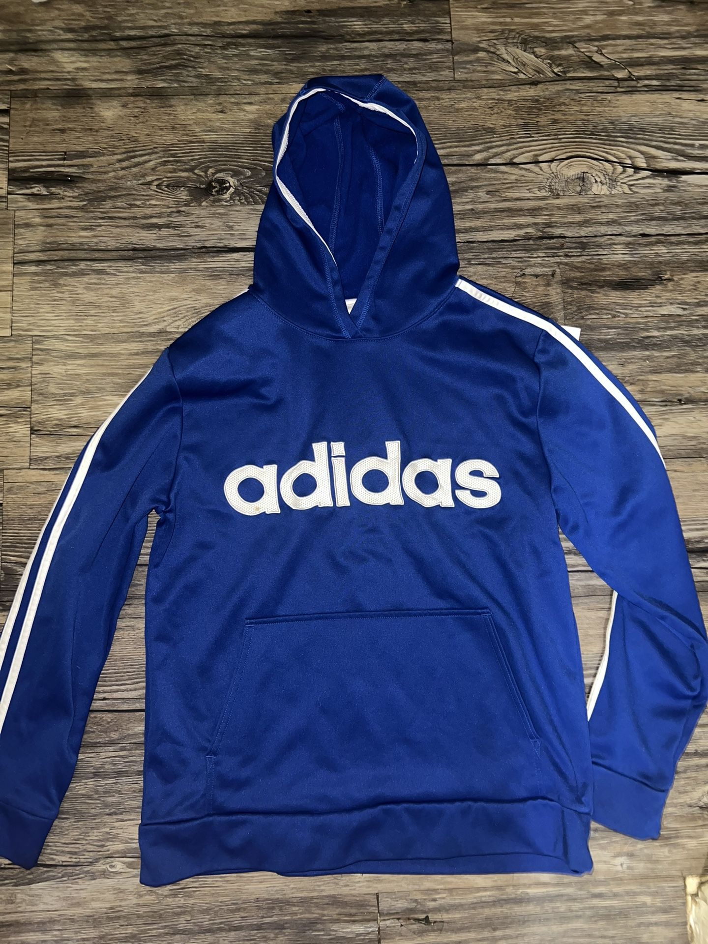 Adidas Hoodie Boy Youth Extra Large ( 18-20) Blue 3 Stripe Pullover Sewn Spell Out Pouch Pocket