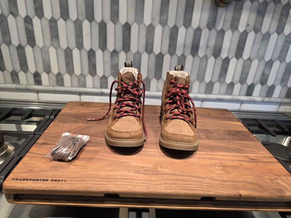 Used but in good condition. Size 13 kids with unused extra brown laces. Details: A sturdy and stylish kids' boot crafted with sealed seams and waterproof leathers, this fortified take on the Robley provides premium protection for light-to-moderate weather conditions. Adding a host of kid-friendly features like antimicrobial lining, cushioned insoles, and easy zip entry, we finish it with a durable molded rubber outsole for enhanced traction. Pair with light rainwear, or jeans and a plaid flannel when skies clear up. This product was made in a factory that supports women in our supply chain with the help of HERproject, a collaborative initiative that creates partnerships with brands like ours to empower and educate women in the workplace. Item No. 1112458K Waterproof Features Seam-sealed construction Waterproof leather Waterproof suede Gusseted zipper with water repellent tape and coatings Non-gusseted tongue Metal eyelets Recycled polyester laces Anti-odor lining or 100% recycled polyester textile lining with anti-odor treatment Foam footbed Molded rubber outsole Woven label with UGG® logo Best for: Casual, Light or moderate rain, Light snow